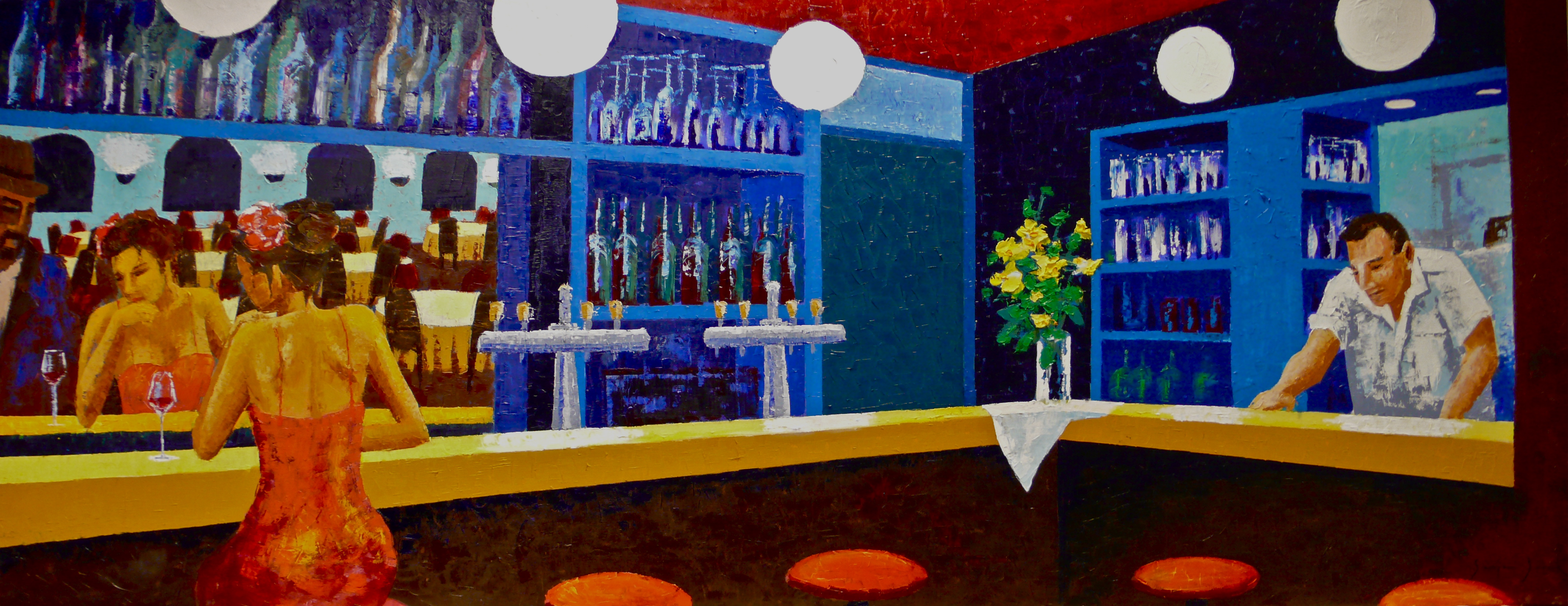 Een vrouw in de bar van het hotel. Man in de spiegel links is een verwijzing naar La Bercheuse van Manet. Geschilderd met het paletmes. Verkocht.
