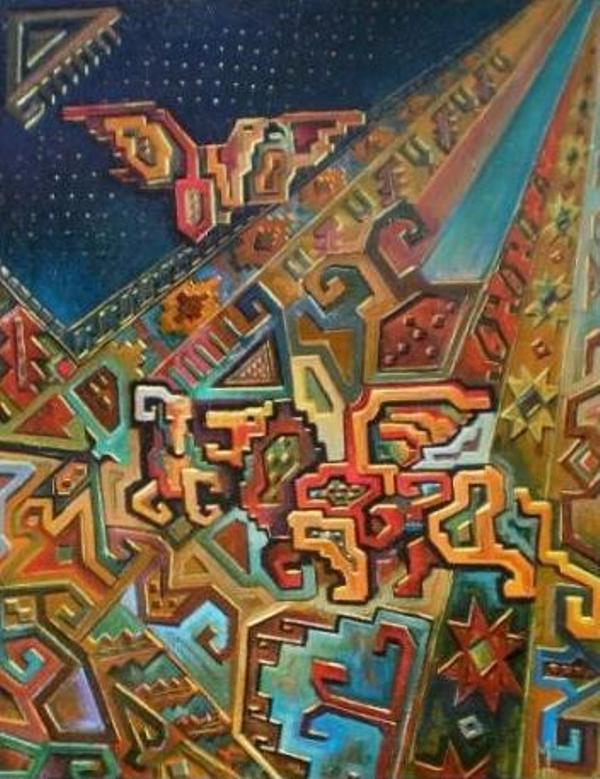 'Deze hardwerkende kunstenaar heeft een hele eigen specifieke timing en creatief proces.Elk nieuw werk is een vervolg op het vorige. Uit zijn eigen creatieve brein ontstaan complexe composities in olieverf.Zijn aparte stijl en techniek zijn uniek.'