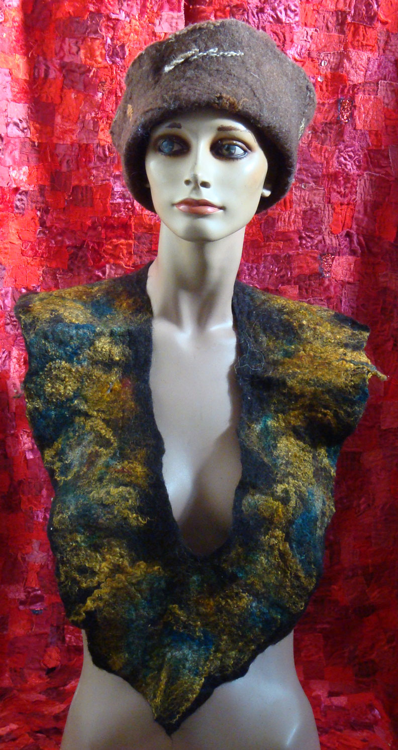 Bruine kraag met zijdevezels in diverse kleuren. Over trui of jas te dragen.