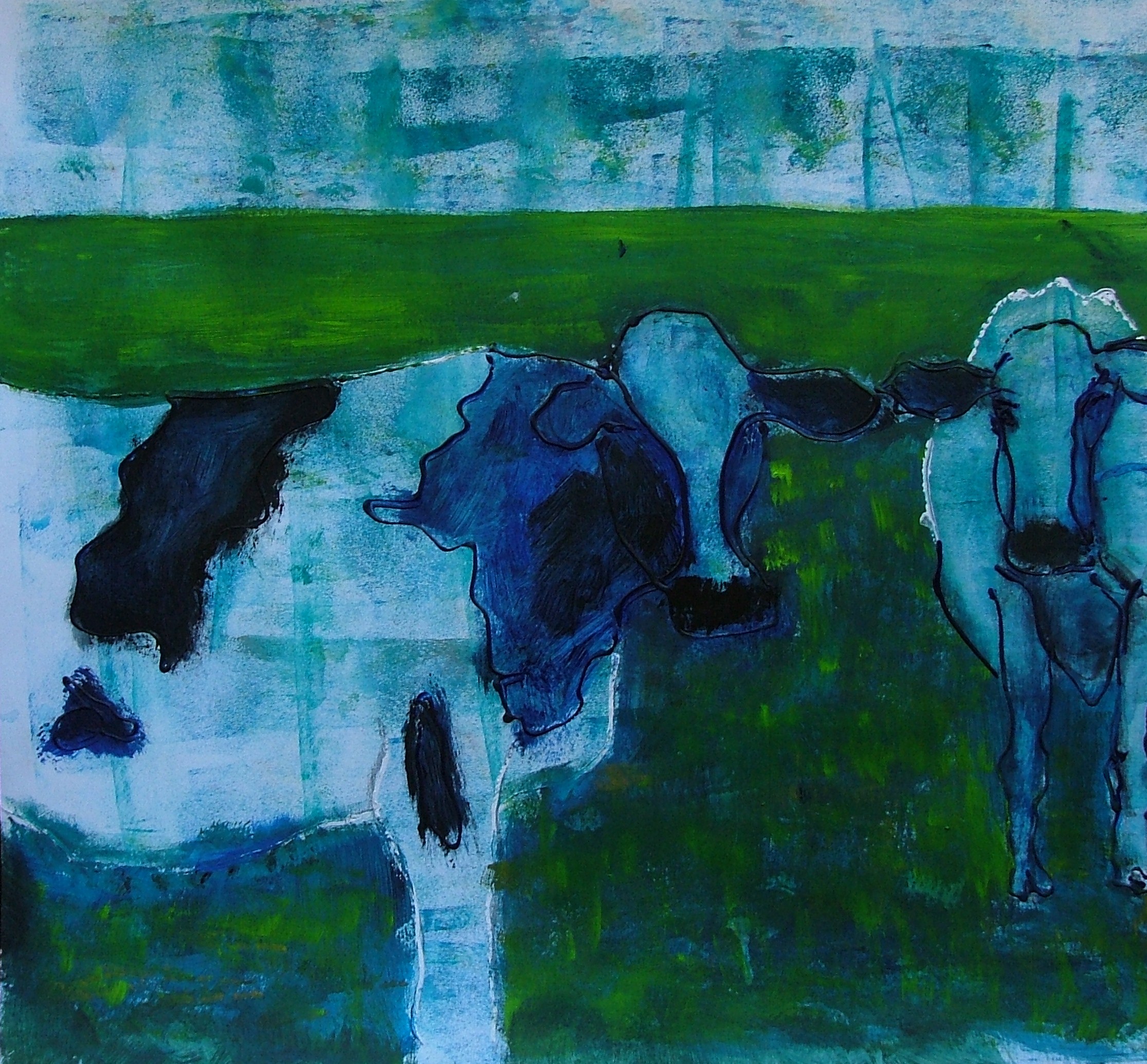Twee blauwbonte koeien in een weiland. Geschilderd met roller, tube en kwast.