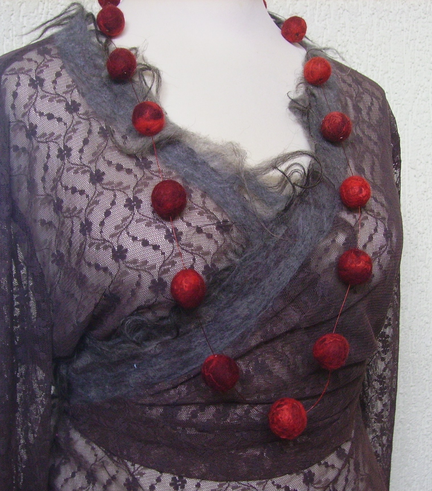 Kralen lang rood snoer. met zijde. twee kleuren rood.