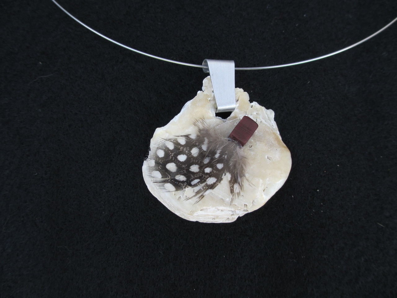 Een bezoeker van het Blomatelier laat in de sieradenstelling een veertje achter. Het veertje (van een voor mij onbekende vogel) heb ik met een glazen vierkante kraal op een stuk schelp gemonteerd. Een haakje van aluminium.