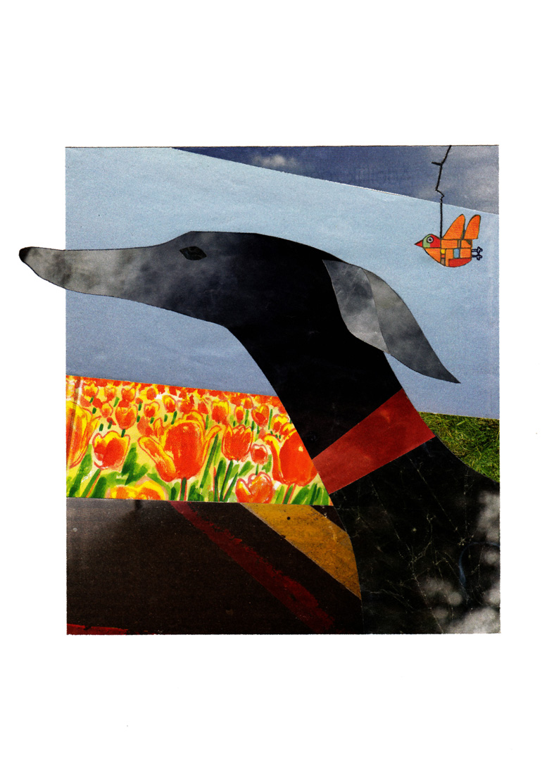 Whippet op pad, in gedachten al verder weg dan het landschap waarin hij wandelt.