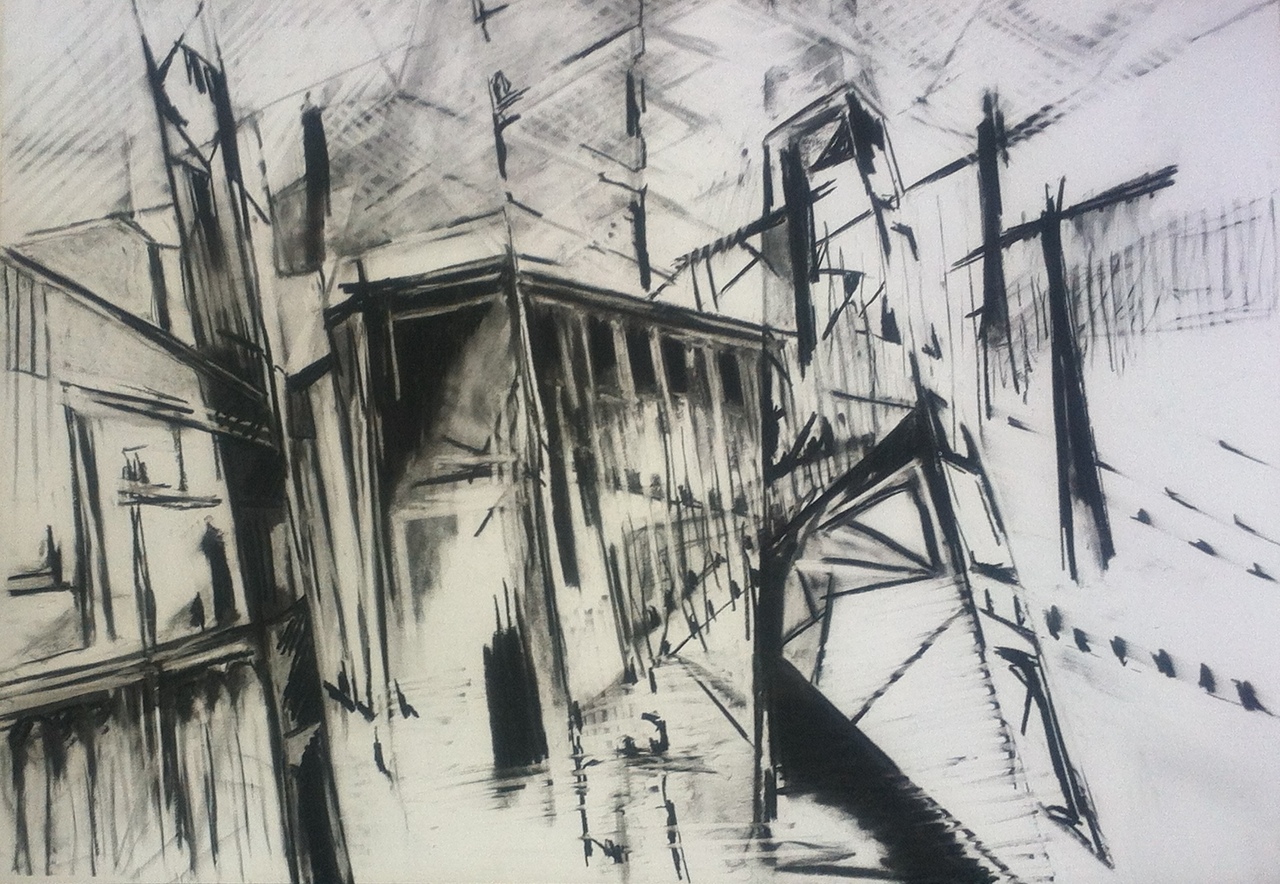 Houtskooltekening geinspireerd door beelden uit een industriele omgeving.
