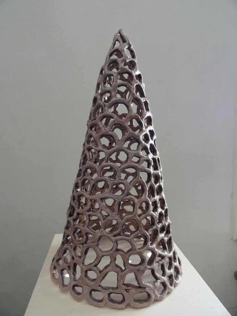 Papierklei met perliet, geglazuurd en gestookt op 1100 graden, zijdeglans mangaanglazuur. Door aaneen schakeling van kleine ronde en ovale onderdelen is een toren ontstaan. Geinspireerd door de potloodwoningen in Rotterdam