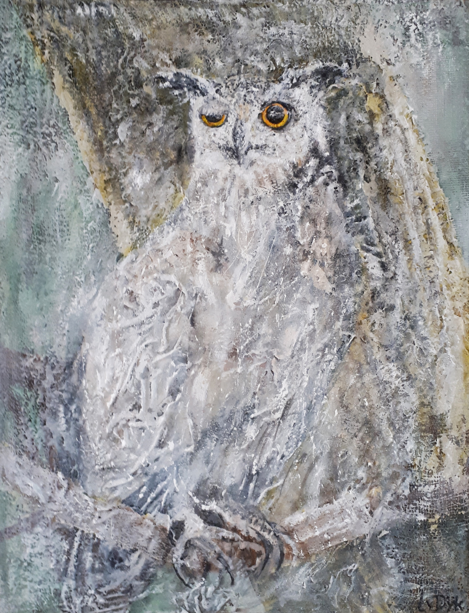 Iets in de buitenwereld intrigeert mij en door deze impressie uit te werken wordt zij blijvend deel van mijn binnenwereld. Laag na laag bouw ik aan de uiteindelijke vorm. Tijdens het werken komt er een stroom van associaties op gang. Het is een constant zoeken naar evenwicht tussen de verf en de andere materialen.