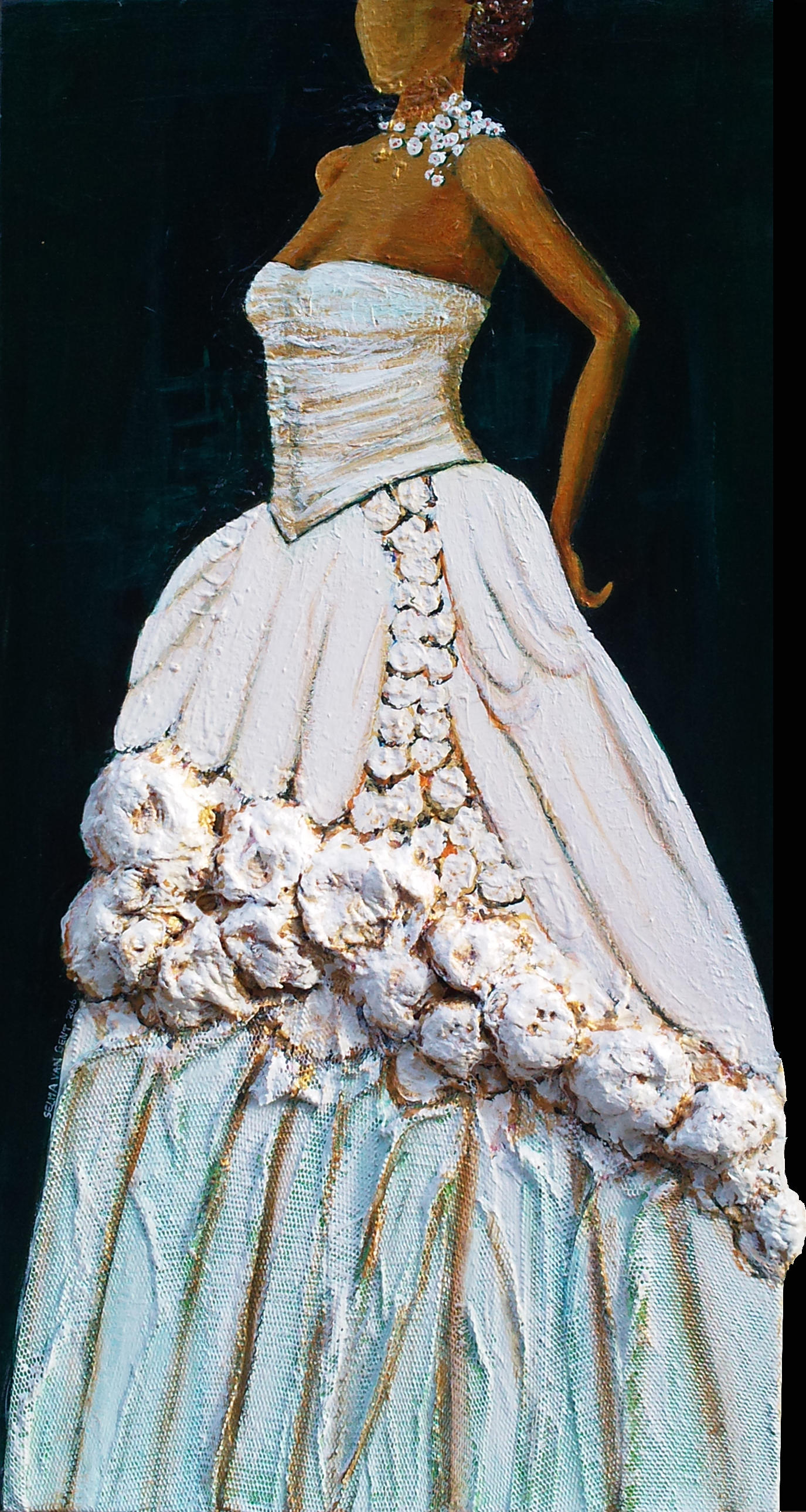 De trouwjurk is 3-d want het is gemaakt van stof en de rondebollen in het midden steken ongeveer 1,5 cm uit het doek.