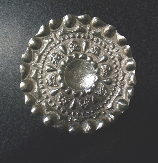 In dit wandbord heb ik langs de rand kwabachtige figuren gedreven en naar binnen toe maskerachtige figuren. Na voltooing gepolijst.