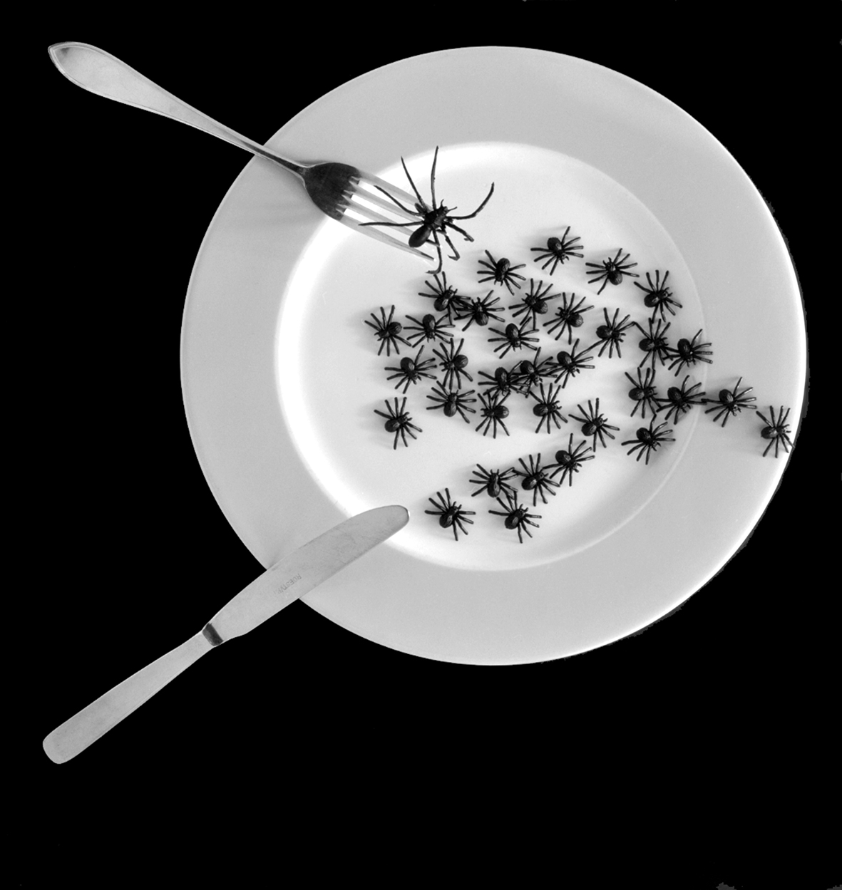 Spin Spider Bord Plate Mes Knife Vork Fork Zwart Wit Black White Eten Eat