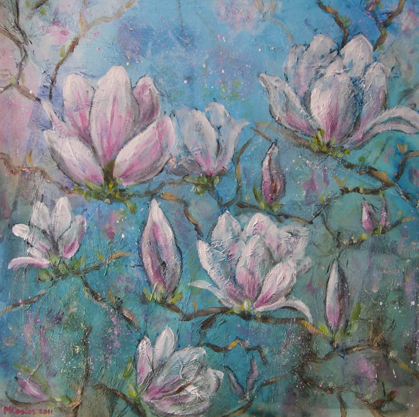 Op een ondergrond van tissues is met gesso en acrylverf naar voorbeeld in de natuur geschilderd. De uitbundigheid van het openspringen heb ik geprobeerd te treffen. Het werk is ingelijst in een brede zilverkleurige lijst. Prijs is compleet met inlijsting.