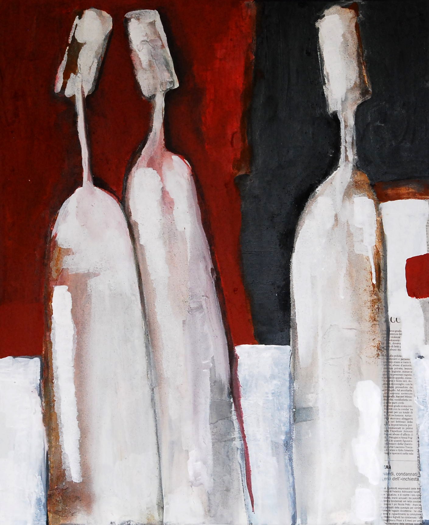 De techniek waar ik mij het meest vrij in voel is een combinatie van acrylschilderen en de collage techniek. Eindeloos experimenteren met vorm, kleur en emotie. De flessen worden steeds meer figuratief en drukken ieder een eigen emotie uit. Het gaat vooral om de interactie tussen de flessen/figuren. Eenzaamheid, hunkering naar 'erbij horen', uitsluiting, groepsvorming; allemaal emoties die mij fascineren.