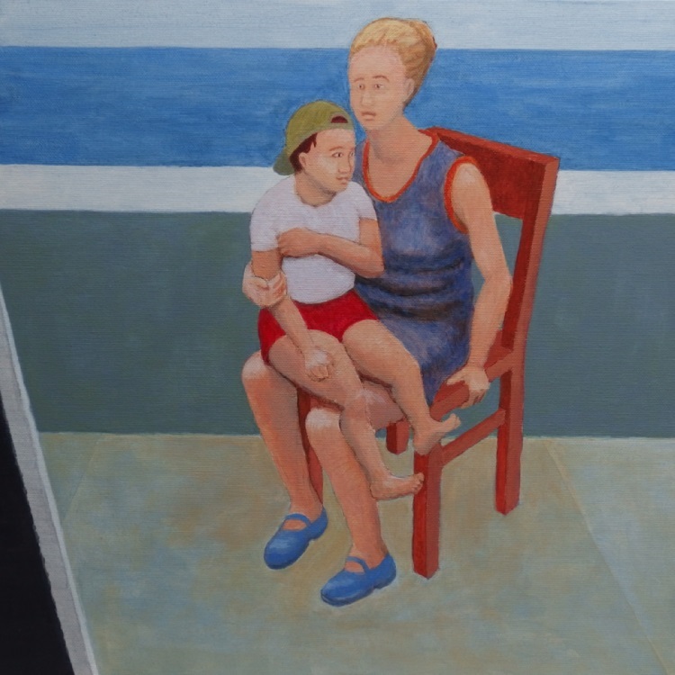 In dit werk uit de "Moederschap"-reeks (2013/2014) zijn twee figuren afgebeeld: een vrouw zittend op een stoel met een kind op schoot. De toeschouwer lijkt van binnen naar buiten te kijken. Het interieur dat in schaduw verblijft is onderin links nog net zichtbaar.