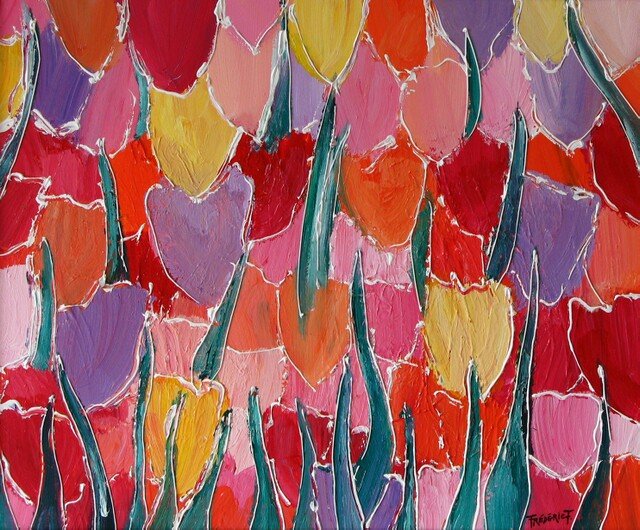 Tulpen in een zomerse sfeer geschilderd met stevige contourlijnen