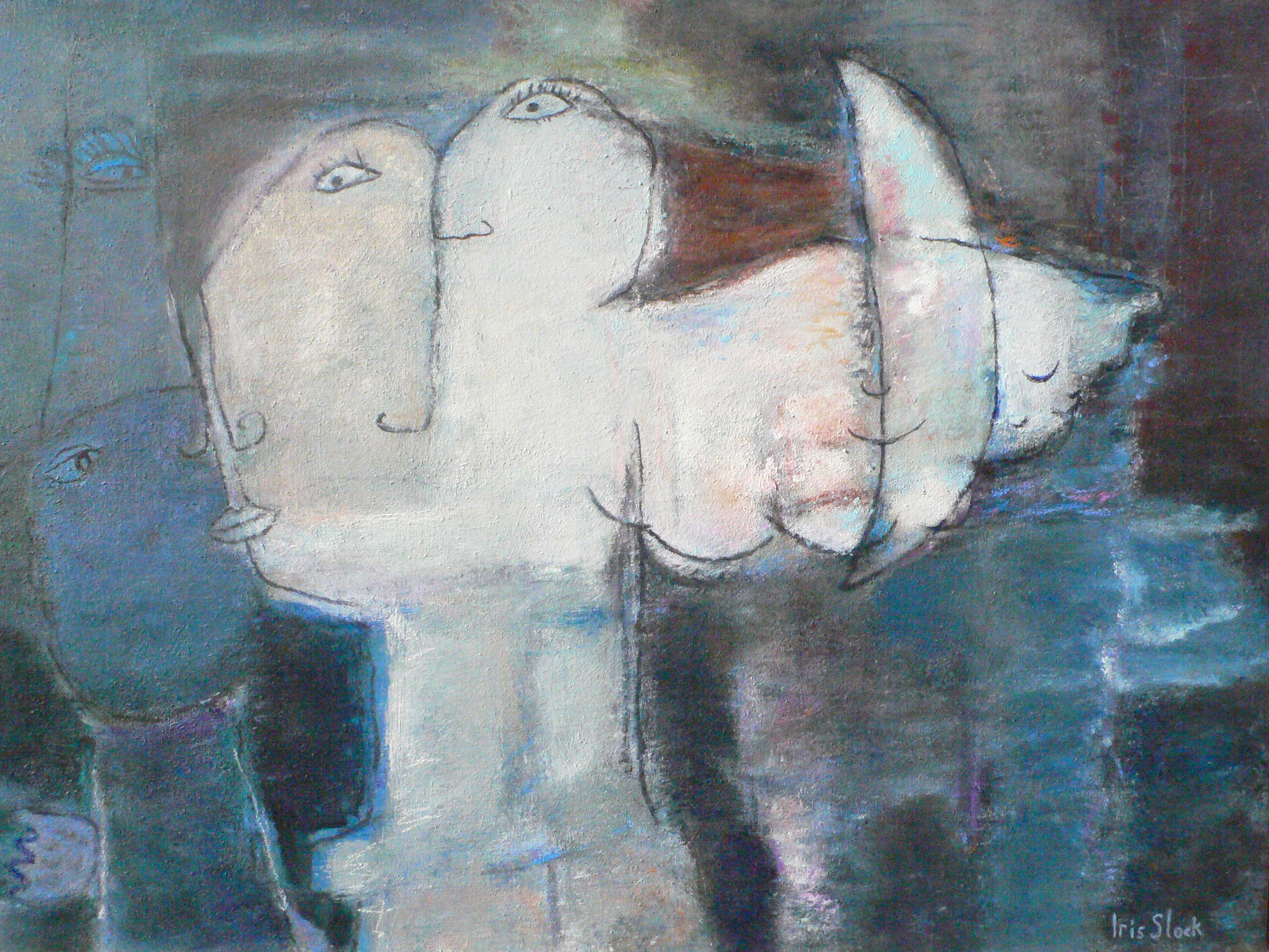 Maneschijn, dromen, samen. Ook in de blauwe vlakken zou je je in de wolken kunnen voelen en weg kunnen dromen. In de vleugel zou je nog een landschapje kunnen zien......droom!