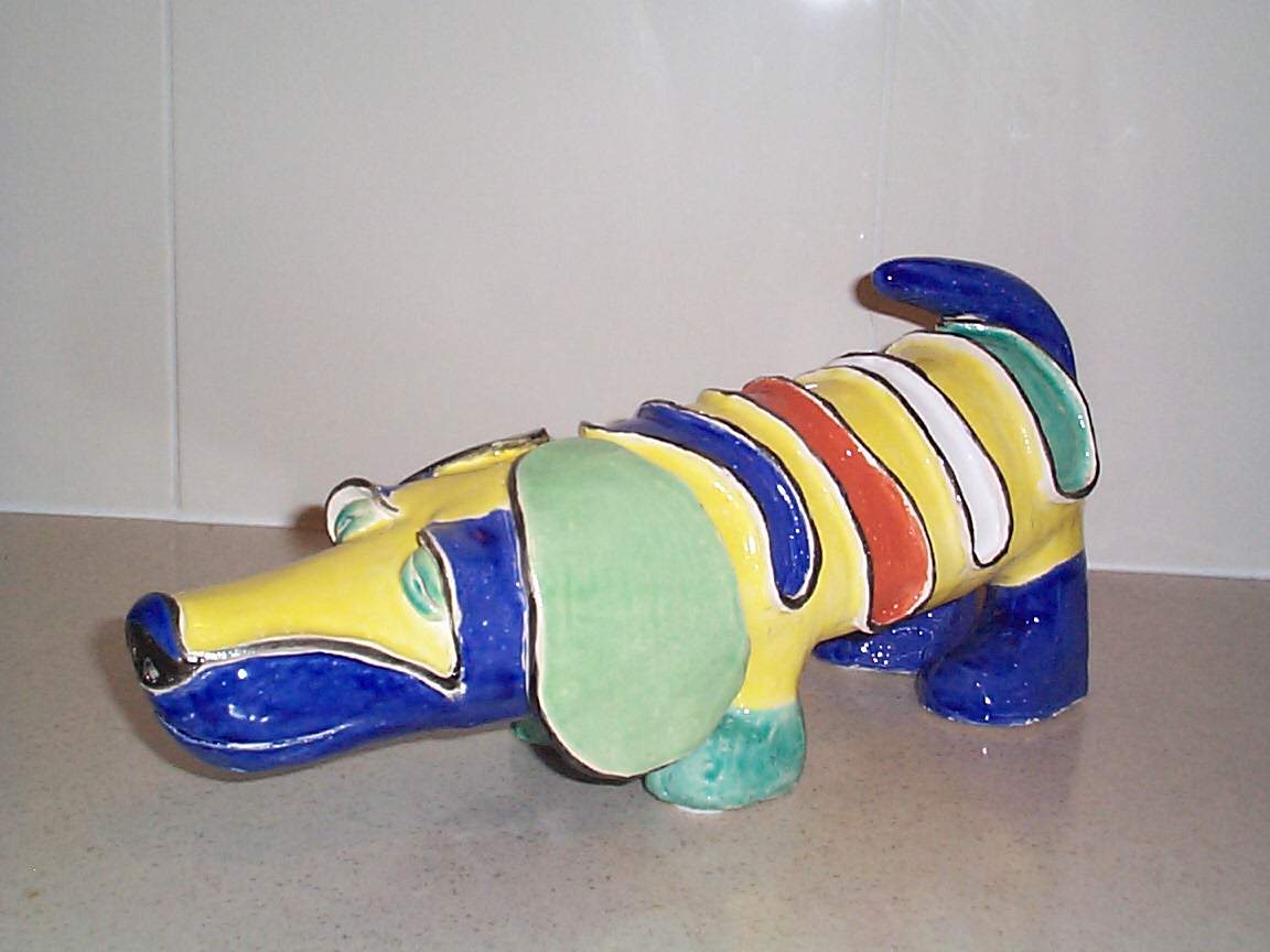 Teckel me again is een holle vorm, handgevormd en opgebouwd uit ringen met grove chamotte. Na de biscuitstook is hij glazuur gestookt op 1020 graden. Het is een unicum.
