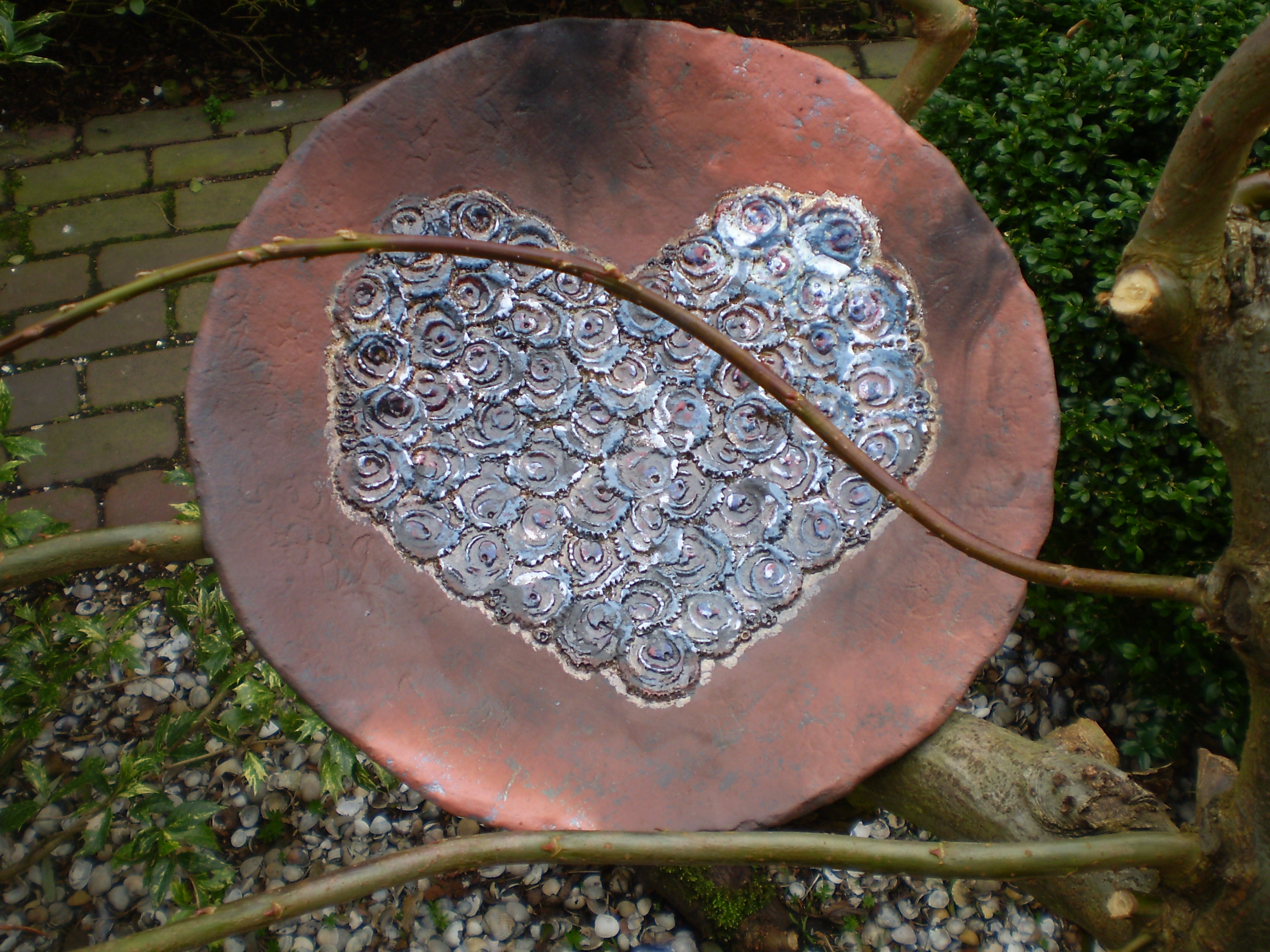 Hartenschaal. Handgevormd, ingelegd met roosmotieven...Bewerkt met engobes en glazuren, daarna rookgestookt.