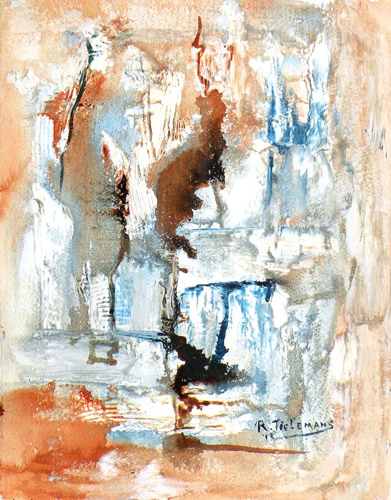 Deze aquarel ademt een dromerige, bijna etherische sfeer. Zachte tinten van oker, roestbruin en hemelsblauw vloeien in elkaar over en creëren een spel van licht en transparantie. De penseelvoering is los en intuïtief, waardoor vormen slechts suggesties blijven — als herinneringen die langzaam vervagen. In het midden lijkt een donkere, verticale beweging de compositie te verankeren, als een schaduw of een figuur die zich tussen twee werelden beweegt. De lichte partijen eromheen stralen rust en stilte uit, terwijl het blauw iets ijl en melancholisch toevoegt. Het werk roept associaties op met architecturale structuren of figuren in een nevelige stad, zonder ooit concreet te worden. Het is een schilderij dat uitnodigt tot mijmeren — een poëtische evocatie van vergankelijkheid en innerlijke landschappen.