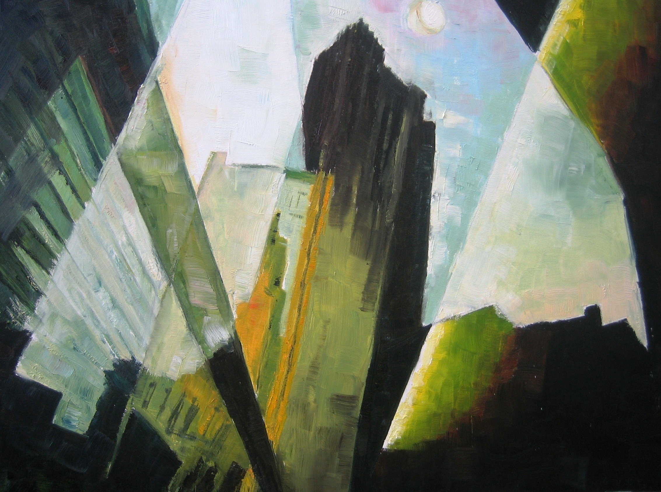 Schilderij Zon Groen Olieverf Venster Weerspiegeling Stad Stadsgezicht Ramen Weerkaatsing Ruiten