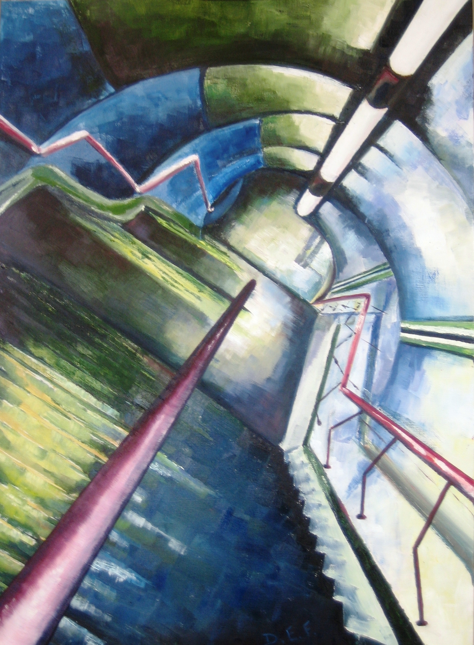 Schilderij Blauw Groen Olieverf Station Metro Trein Diepte Trappen
