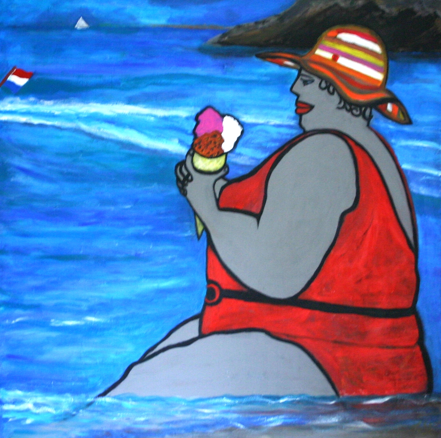 ZIJ ZIT OP HET STRAND EN GENIET VAN EEN IJSJE