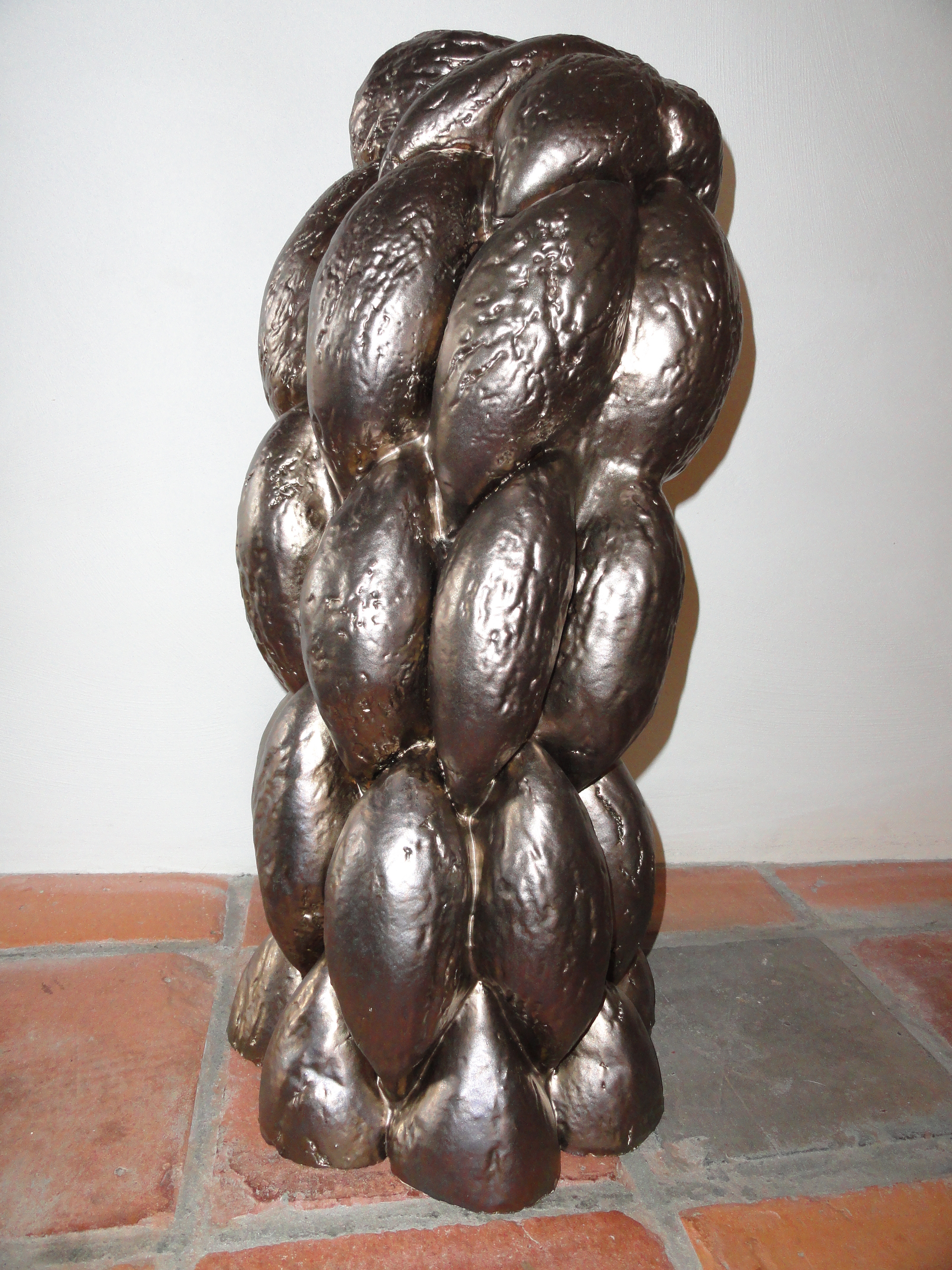 uit de serie bomen: met de hand gevormd in de mal en vervolgens geschakeld en gestapeld, geglazuurd met aardewerkglazuur stoffig goud en gestookt op 1060 graden