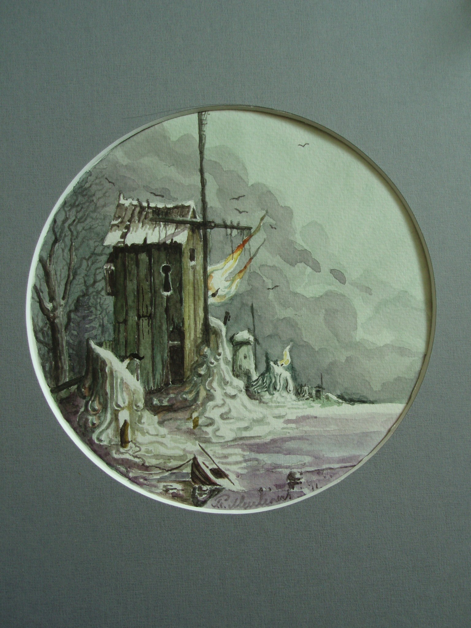 Zee Landschap Romantiek Papier Aquarel Winter Kaarsen Realisme Fantasie Vuur Molens