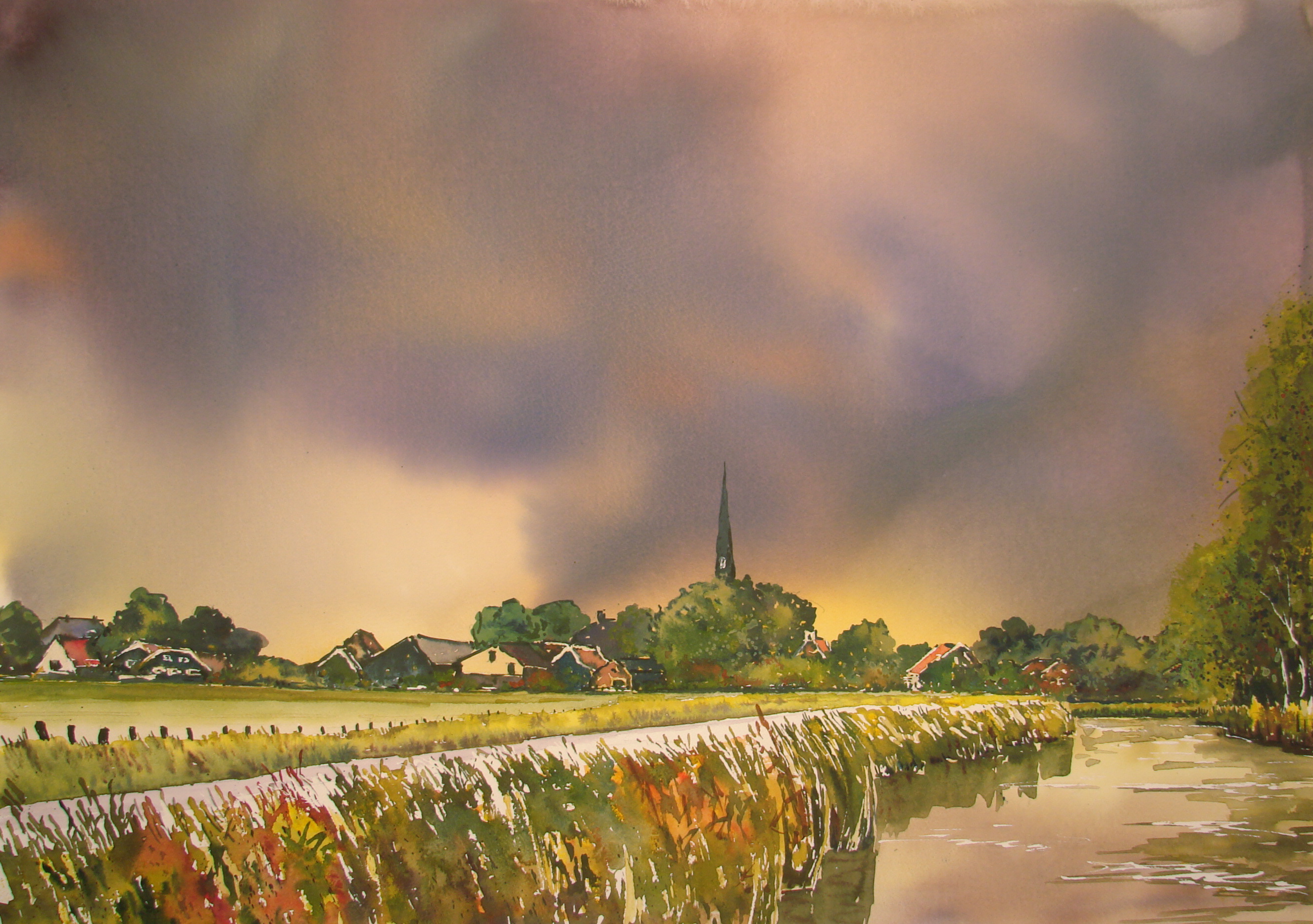 Realistische aquarellen en olieverf schilderijen van Hollands landschap, met altijd expressieve luchten boven de lage horizon zich spiegelend in de waterrijke polder. Ook werken uit de Franse Morvan en van de Oostelijke Algarve in Portugal.