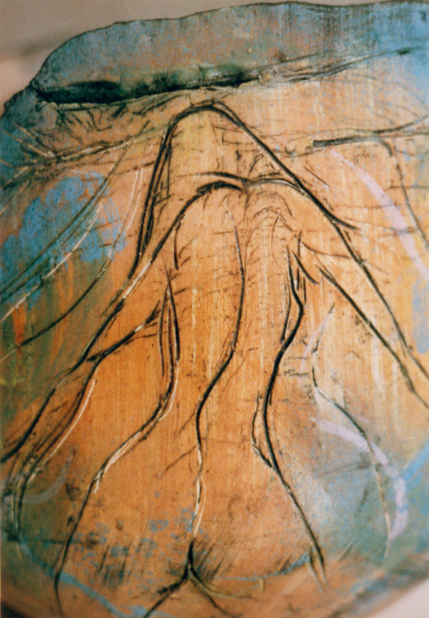 Een detailfoto van keramisch object "rondelendans". Onder deze foto bevindt zich de video "keramische objecten geïnspireerd op modeltekeningen".