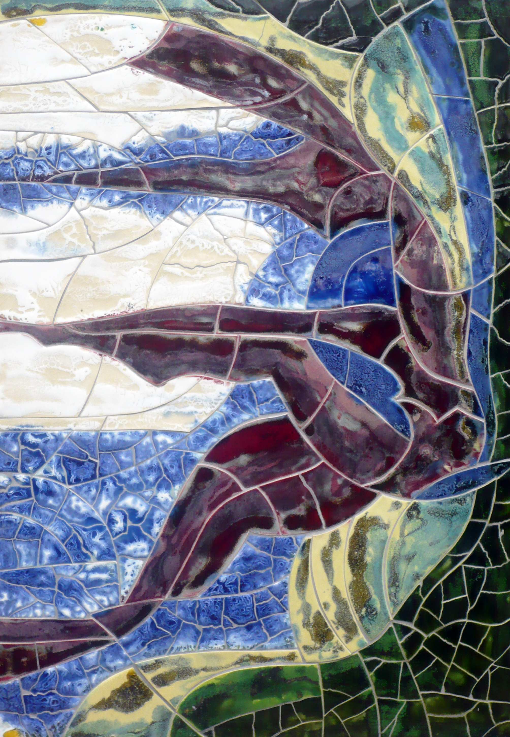 Keramisch mozaïek, deels trencadis, glazuurtinten. Als in een groene oase.