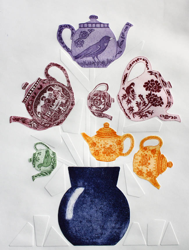 Kleuretsen van verschillende theepotten verbonden door blinddrukstelen, ingelijst in 57x72cm