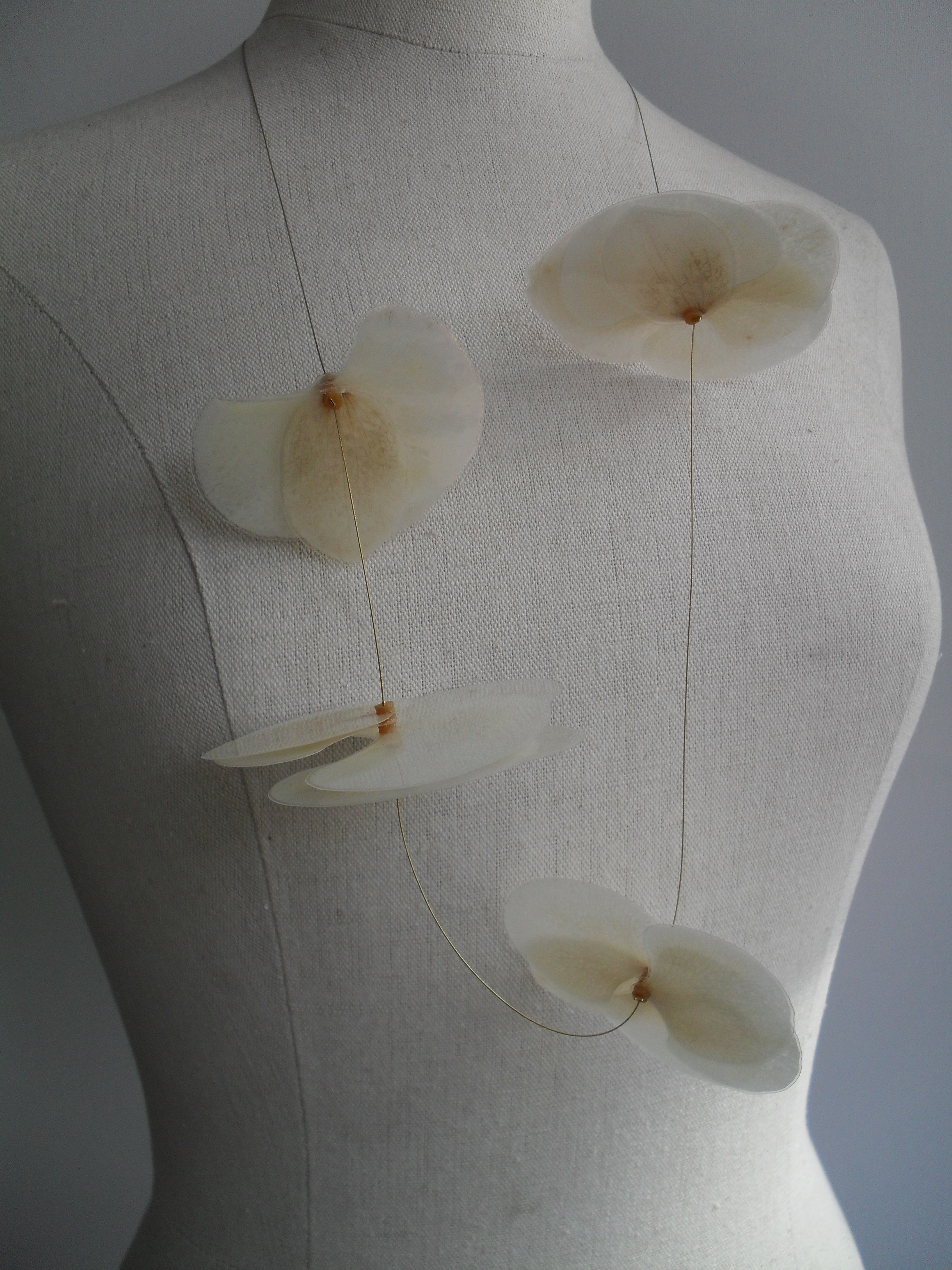 Sieraden van ongewone materialen, vergankelijke sieraden van natuurlijke materialen, experimentele sieraden, textiele sieraden, tijdelijke toevoegingen aan jezelf, grapjes om te dragen of om een statement te maken, Het belangrijkste in mijn werk zijn verrassing, verbazing en een glimlach