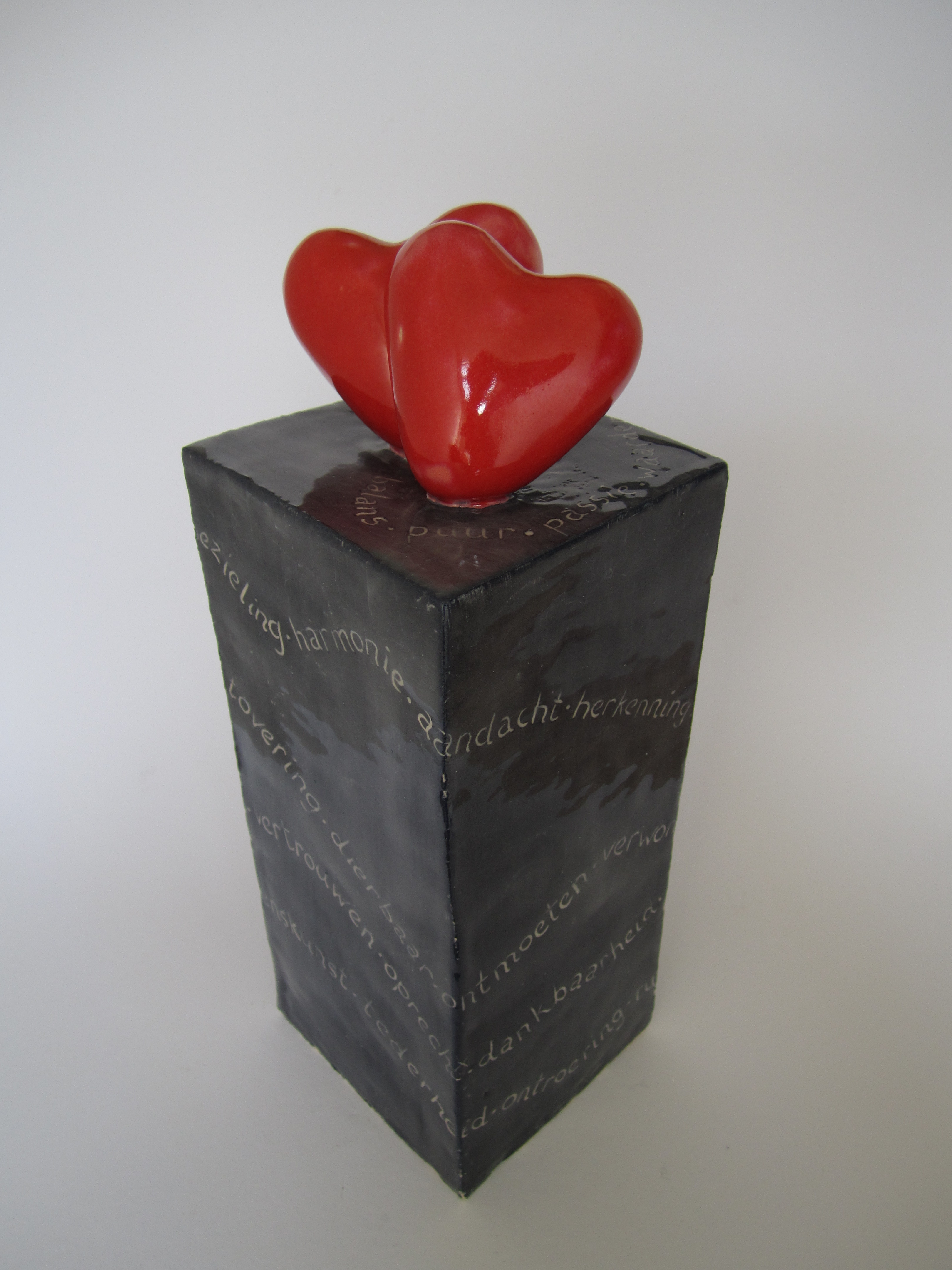 Liefde in woorden gevangen. Witte chamotteklei, bewerkt met engobe en glazuur.