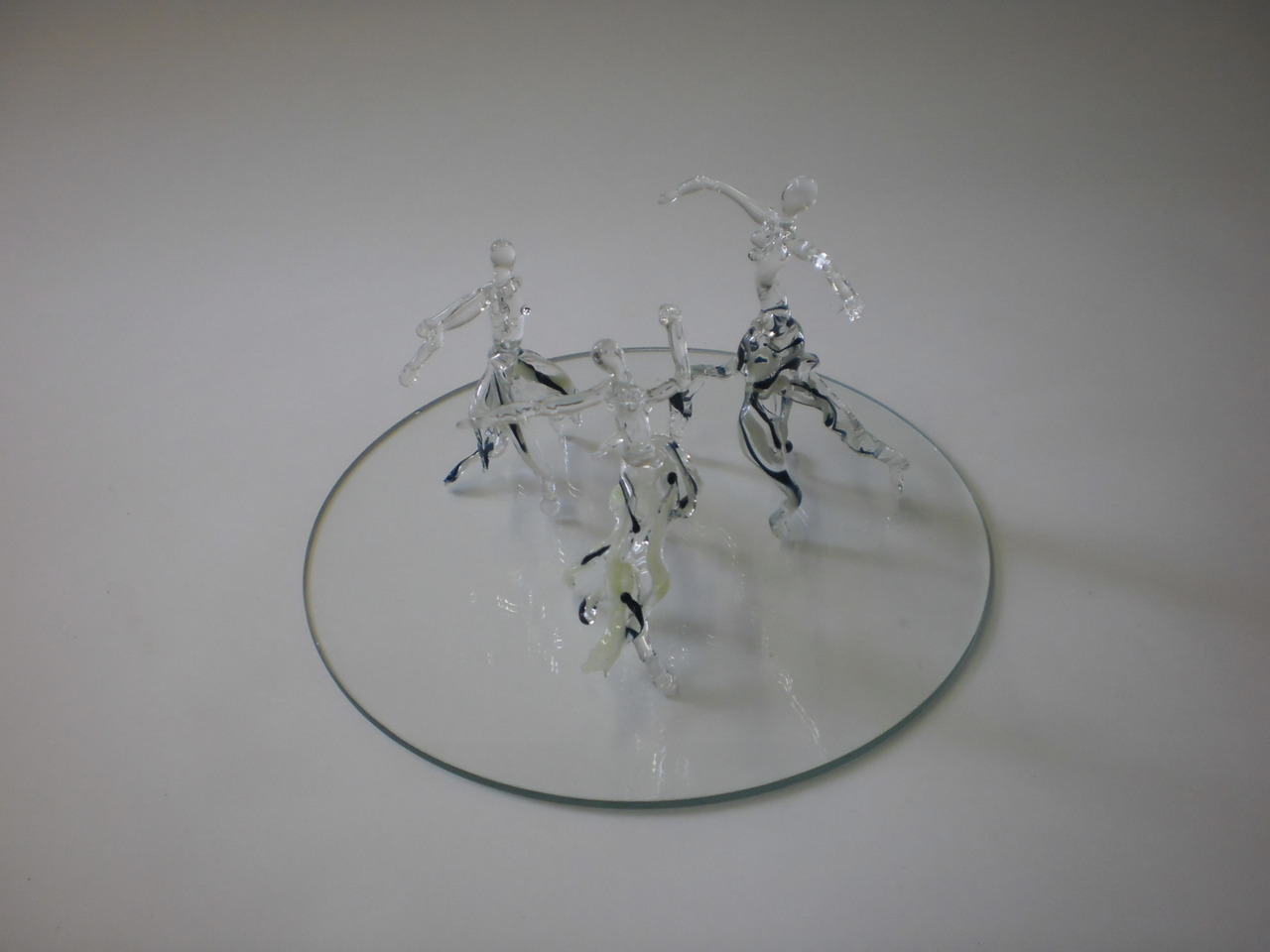 Vrolijke glasfiguurtjes, dansend op een glazen plateau