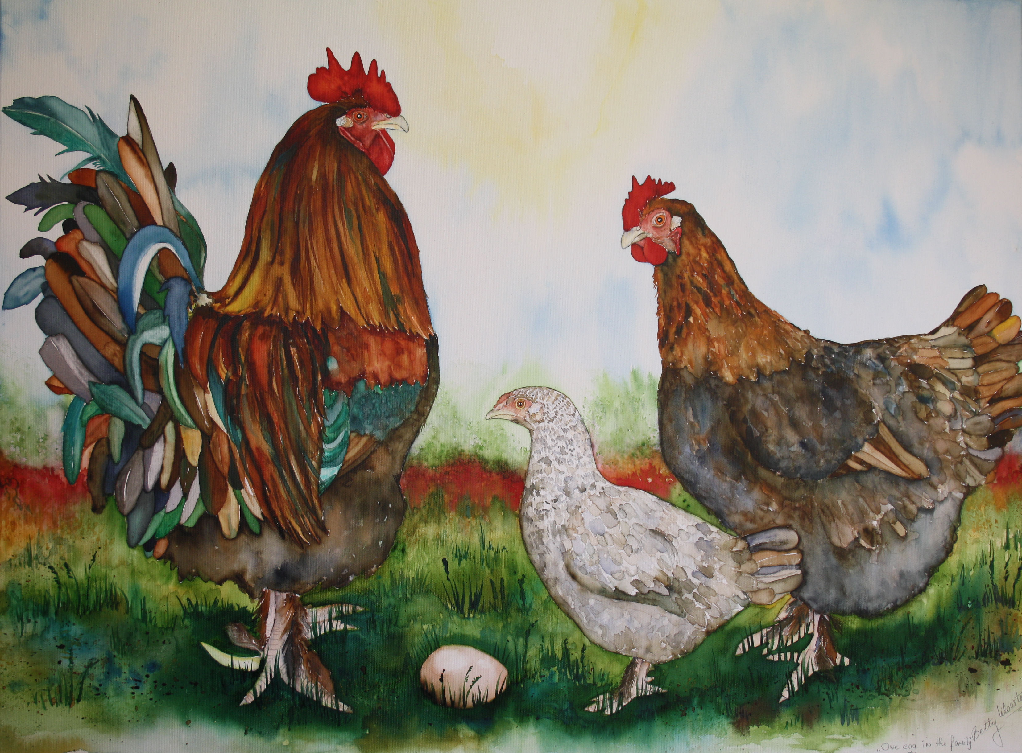De hele familie inclusief het net gelegde ei....... Portret van haan,kip en halfwas kuiken. Aquarel door speciale techniek op doek geschilderd.