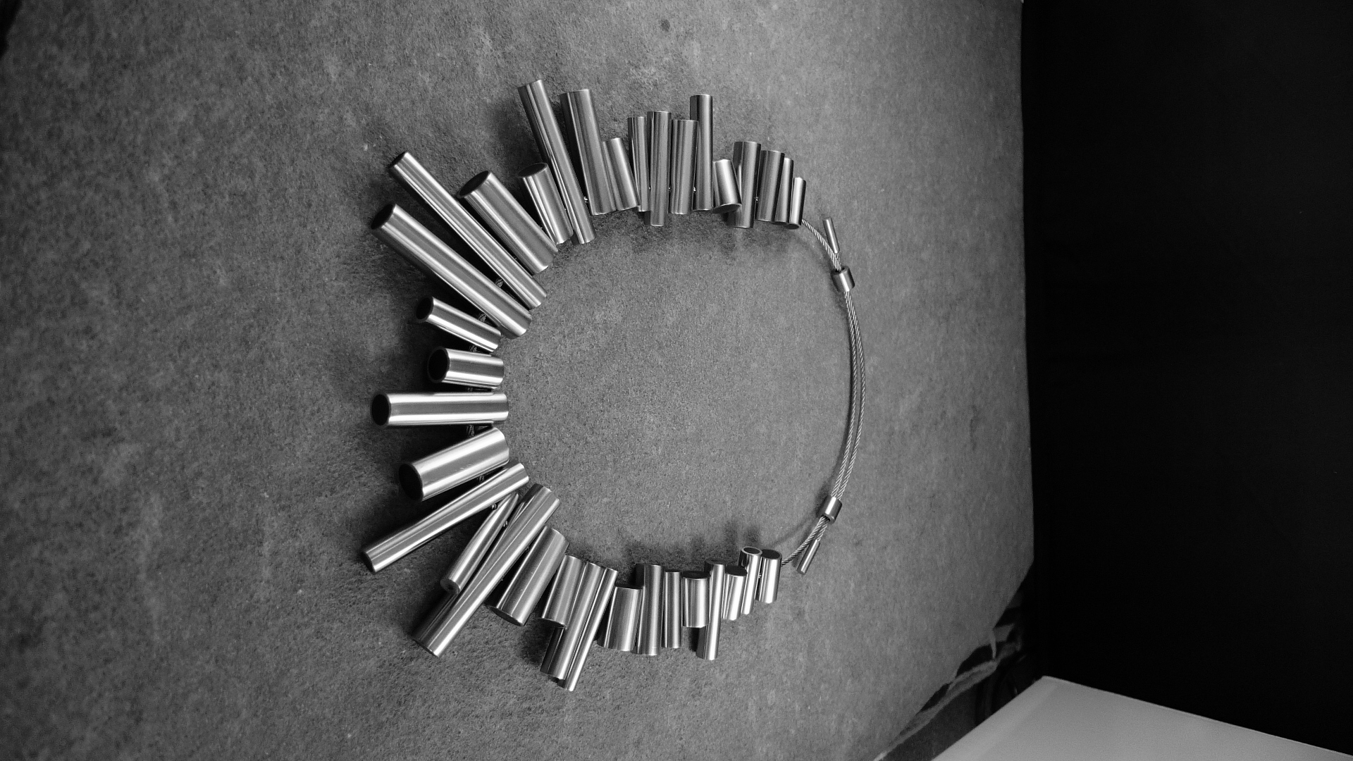 Groot halssieraad, bestaande uit aparte elementen, ingelegd met rubber.