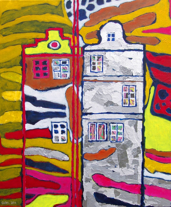 Aboriginal patronen verwerkt in voor- en achtergrond waardoor de grachtenhuizen verweven zijn in het patroon.