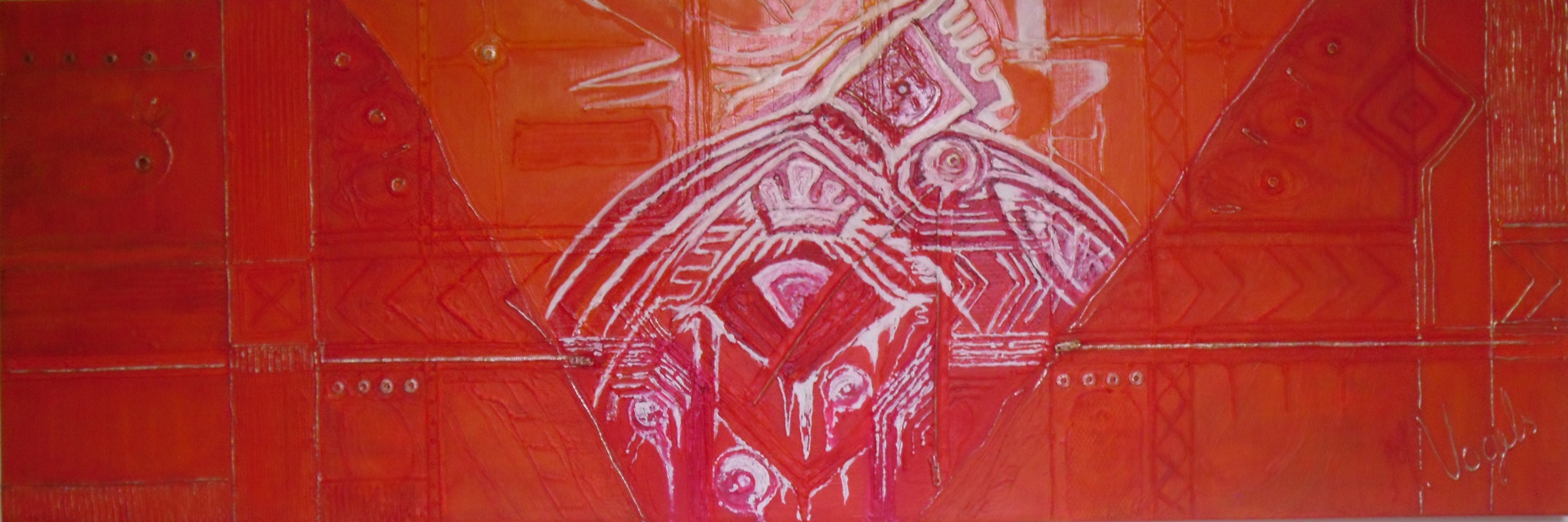 Rood oranje horizontaal doek met veel 3-dimensionale effekt en goudkleurige accenten