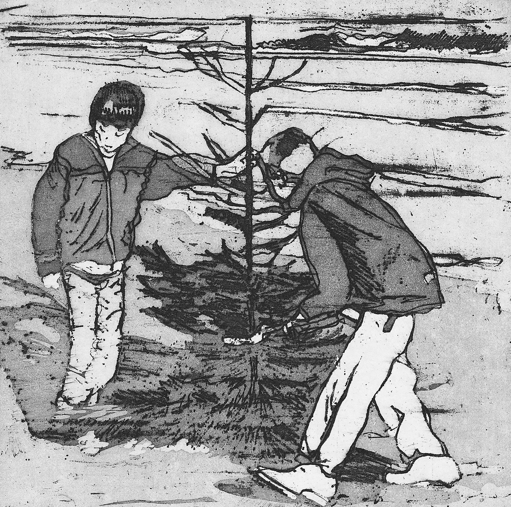 Jongens Kerstboom Strand Zand Golven Zee Schep Ets Aquatint Zwart Realistisch Verhalend Boys Christmastree Beach Sand Sea Waves Shovel Etching Black Realistic