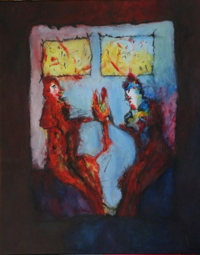 Twee figuren in een kamer, wat is er tussen hen? Acrylverf en oostindische inkt.