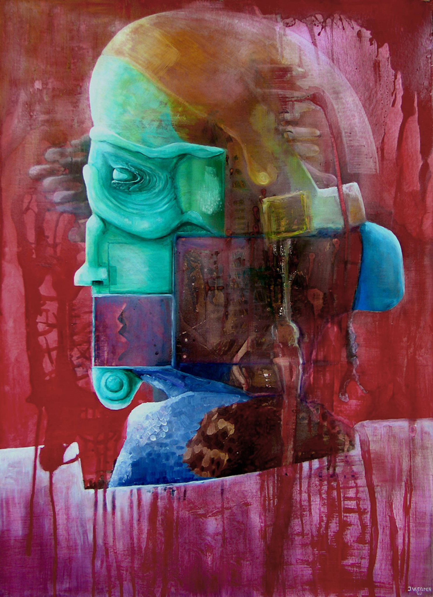 Rood Mixed Media Kleur Ontaard Cybervrouw Mensen Kunst Cyberwoman Vrouw Depersonalisatie Digitaletijdperk Derealisatie Onaards Groen Schilderkunst Schilderijen Acrylverf