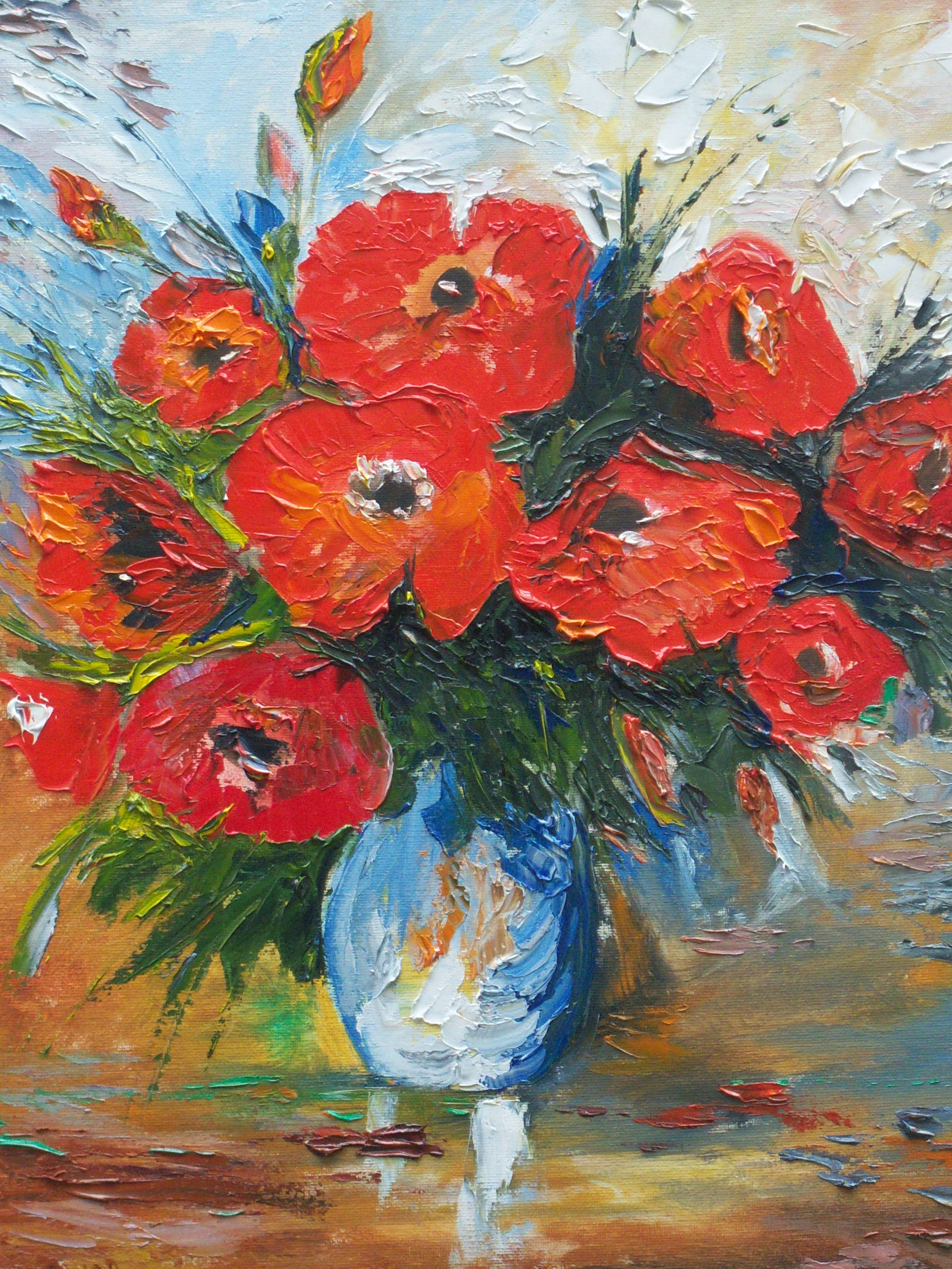 Red Flowers Still Life Flower Display Poppies Rose Vase Blue Impasto Painting Conor Murphy