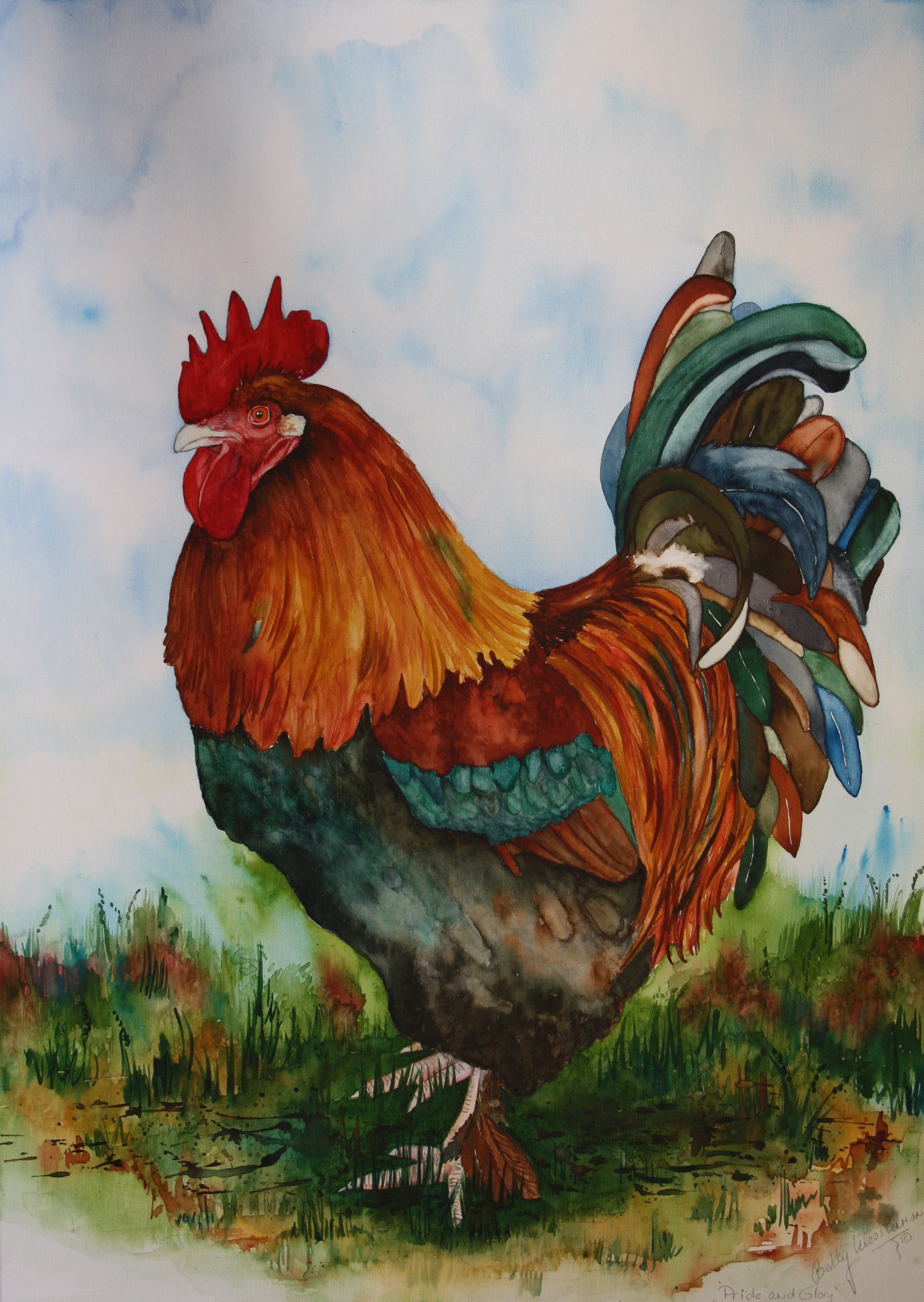 Portret van onze Maran haan, trots en in al zijn mooie kleuren. Aquarel door speciale techniek op doek geschilderd.