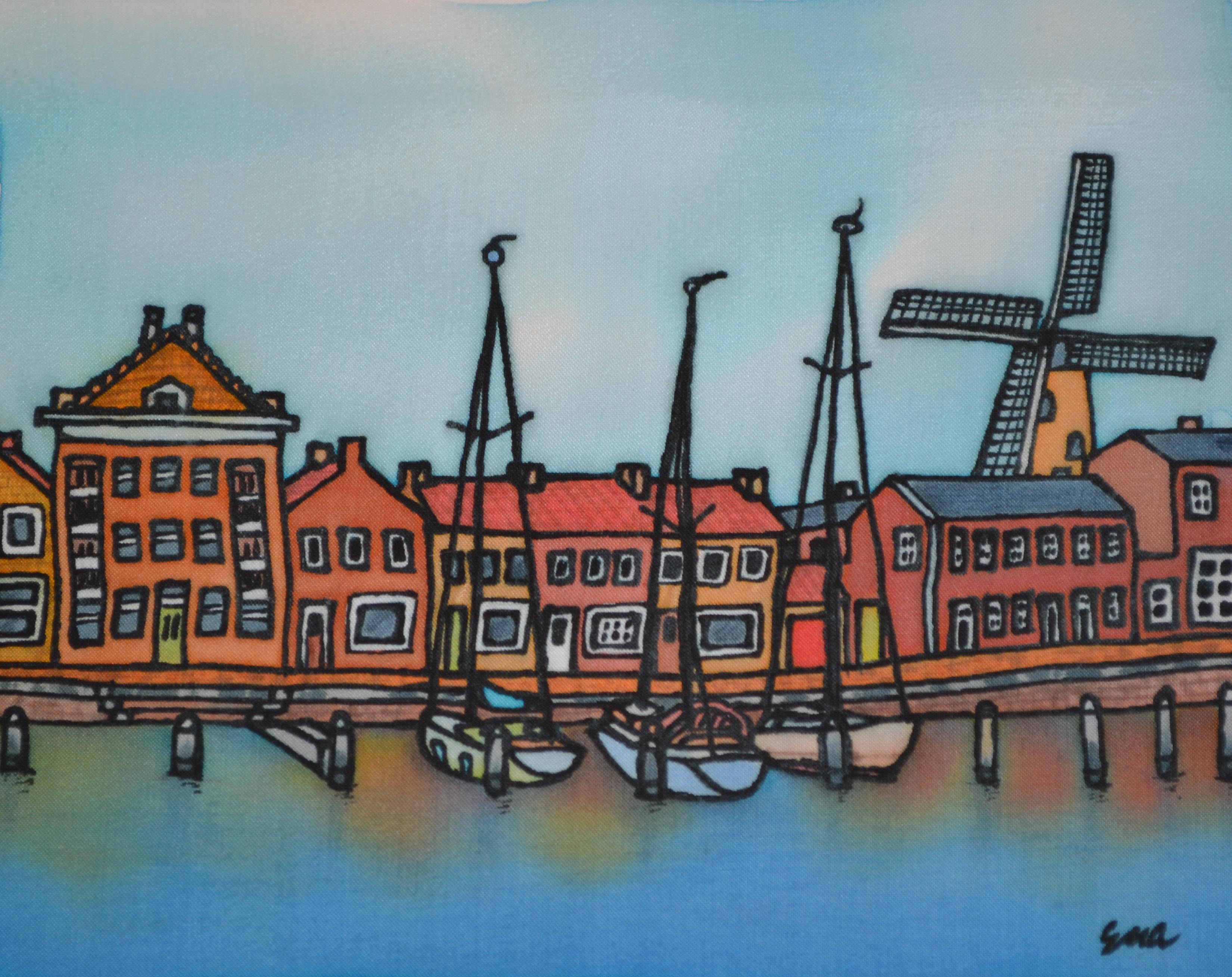 Inkt op Zijde Schilderij "De Vesting met Zeilboot" in Hellevoetsluis. Te koop bij de Kunstuitleen in Hellevoetsluis. www.kunstuitleenhellevoetsluis.nl Interesse?stuur mij een email.,VERKOCHT