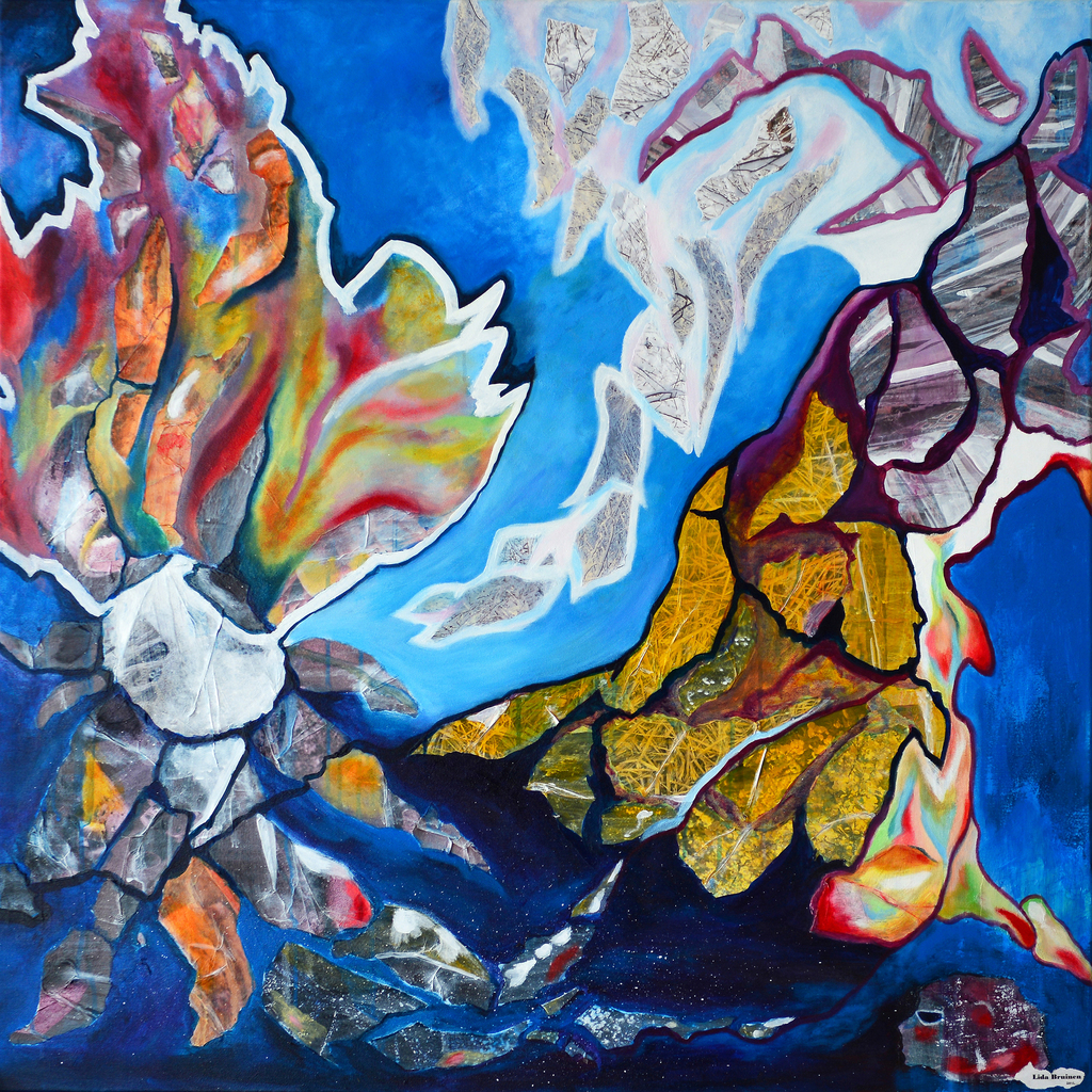 Ik heb eerst een collage gemaakt met snippers van afbeeldingen uit de natuur, zoals stro en takken, als uitgangspunt voor dit schilderij. Het uiteindelijke resultaat doet meer denken aan de wonderlijke onderwaterwereld, die ik als duiker zo bewonder. Op 4 cm dik doek. Ook te verkrijgen als print via http://www.werkaandemuur.nl/index/86/nl/The-great-deep-blue/view/46621/0 of lida-bruinen.pixels.com