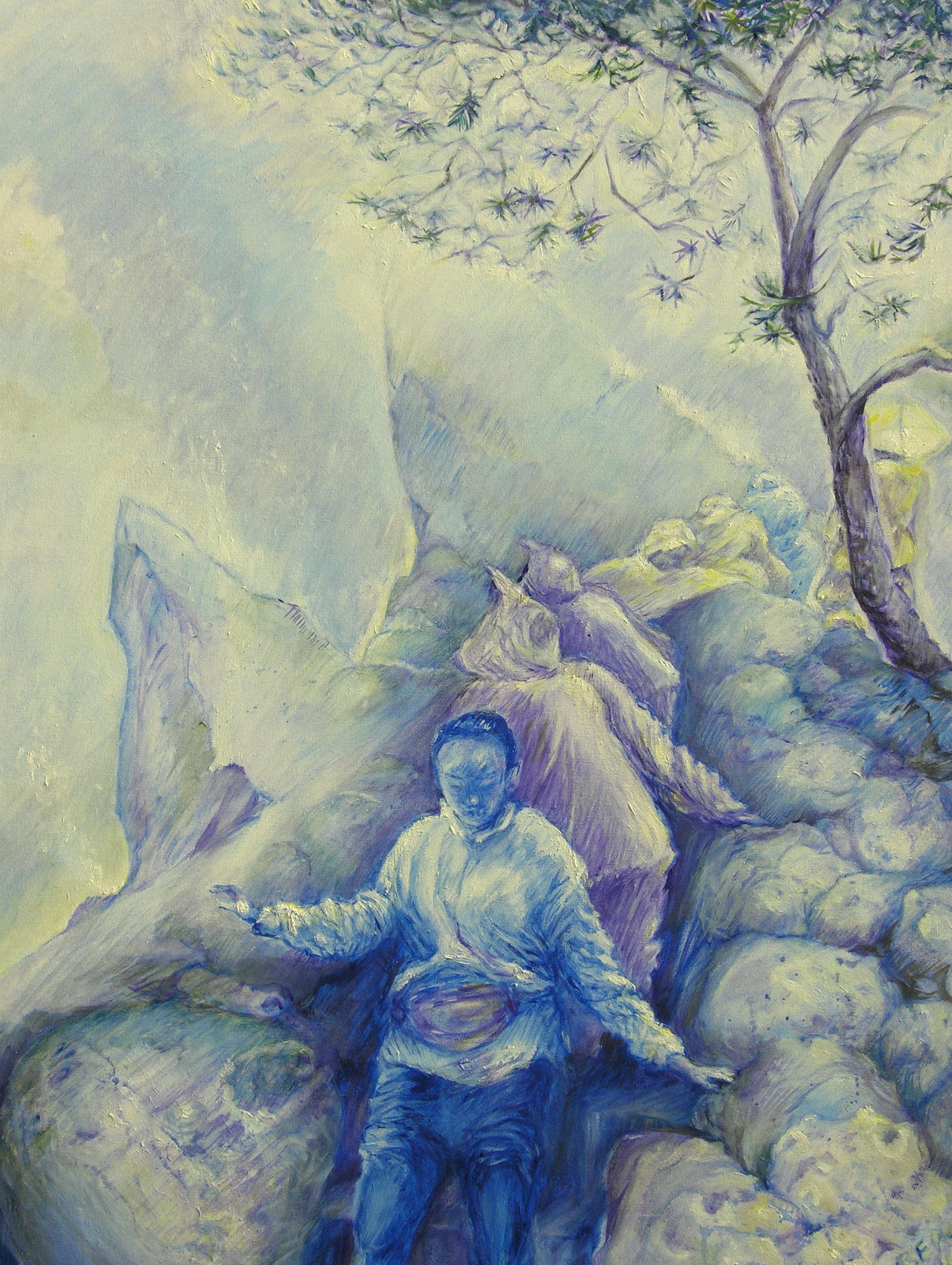 De gele regenjassen lichtten op in de grijze mist. Het geel dat zich van nature naar de voorgrond dringt is erg teruggedrongen naar de achter grond. Zonder dat geel zou het werk veel saaier zijn. Zoeken naar het evenwicht niet alleen in filosifisch en fysiek opzicht, maar ook vanuit het schilderkunstige perspectief.