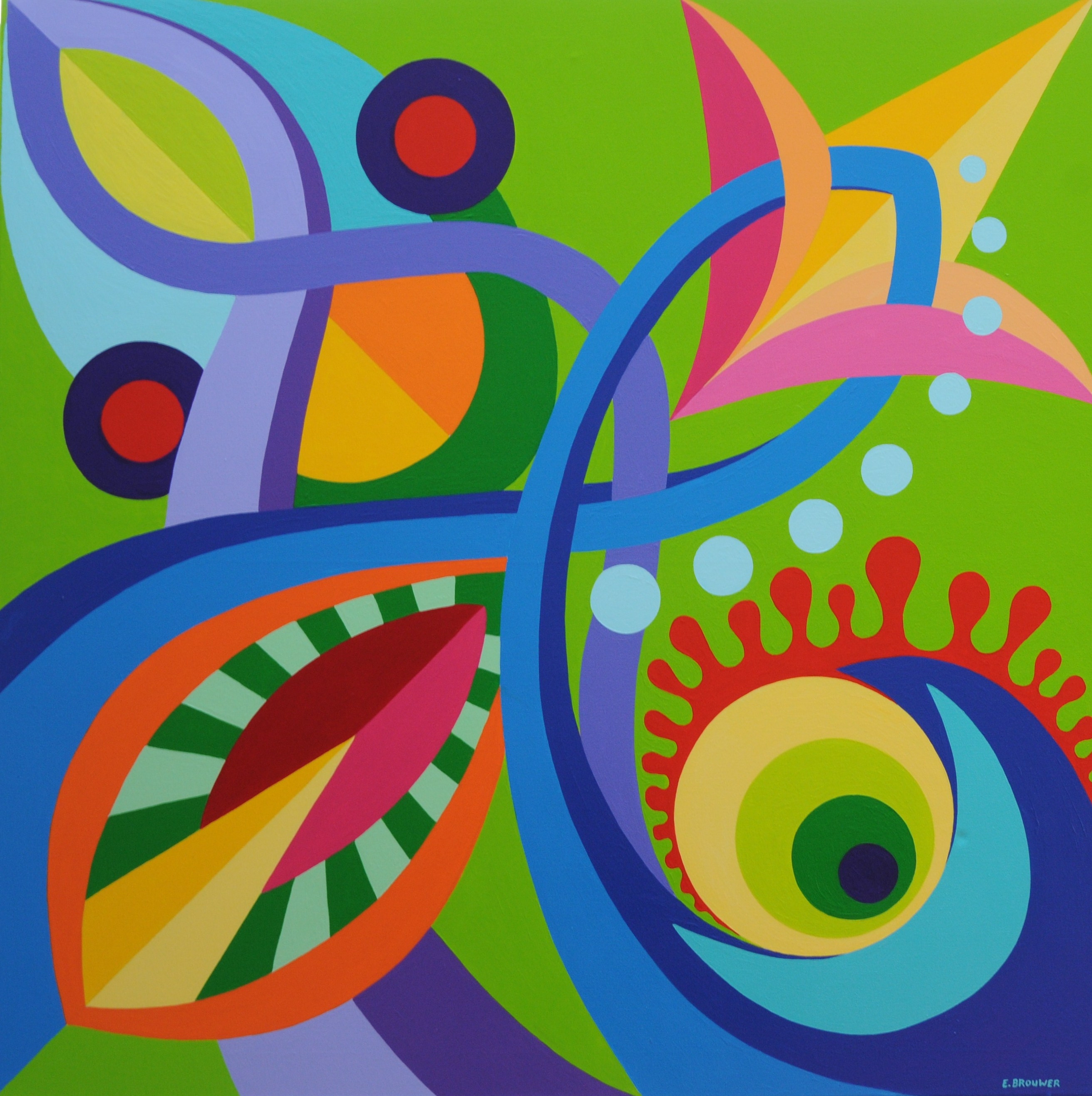 "Flow" Combinatie van geometrische en organische fantasie vormen. Inclusief blauwpaarse houten baklijst