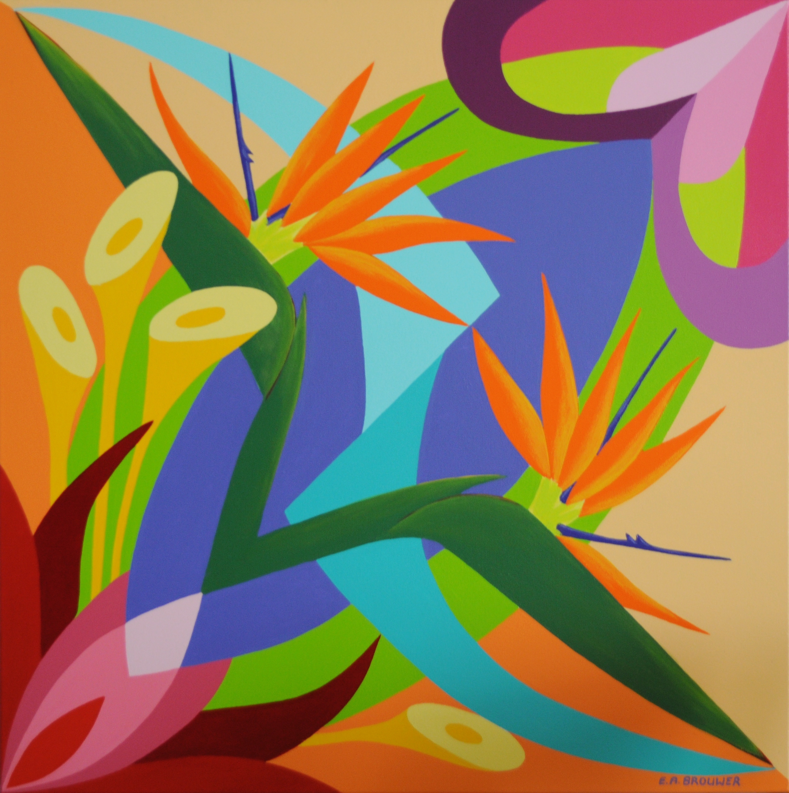 "Paradijsvogelbloem" Kleurrijke geabstraheerde vormen die samen een geheel vormen. Inclusief witzilverkleurige houten baklijst. VERKOCHT