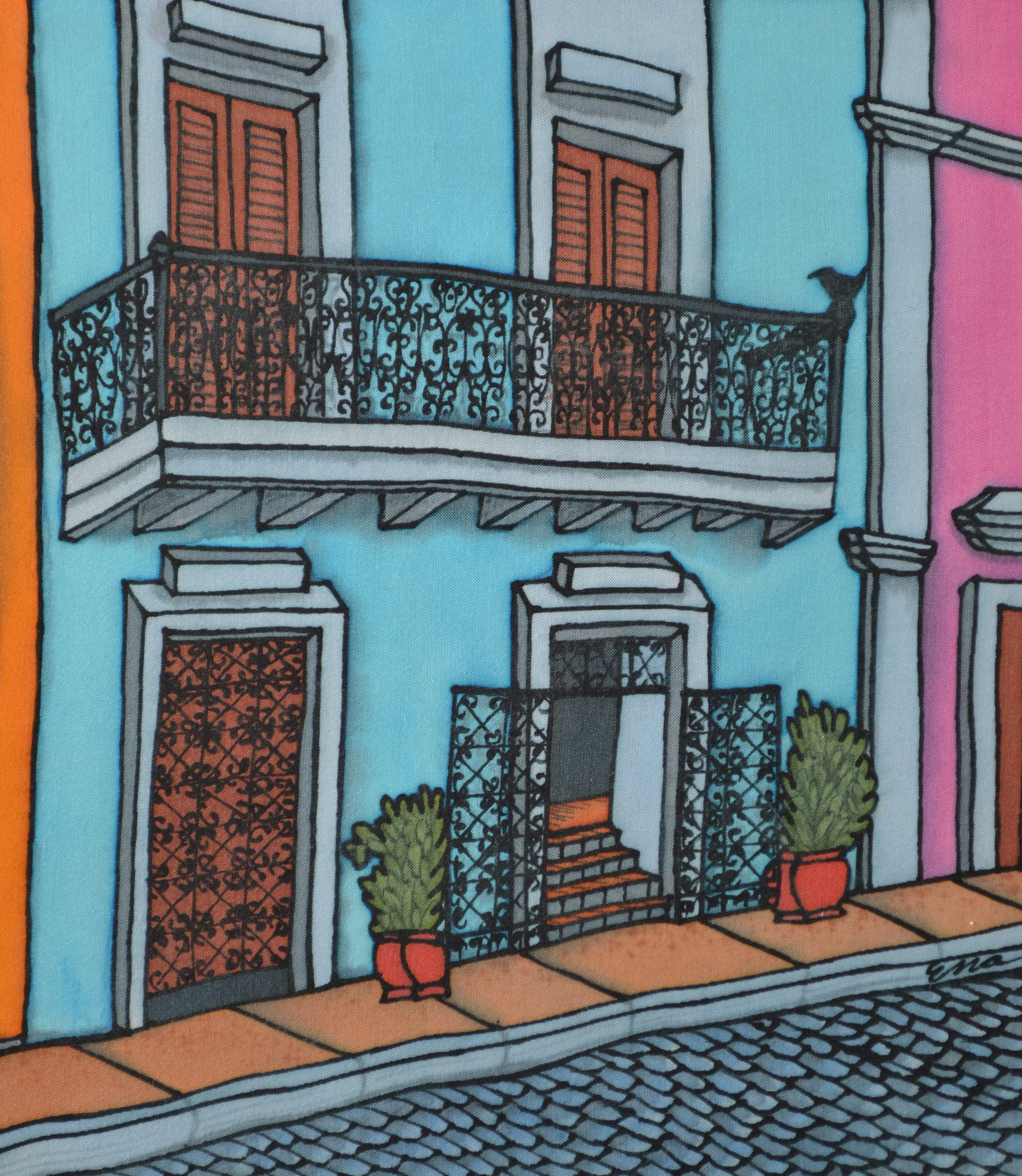 Ink op zijde schilderij van een balkon in de stad "Old San Juan" in Puerto Rico, U.S.A.. Galerie Arte y Mascaras in San Juan Puerto Rico. Niet Te Koop