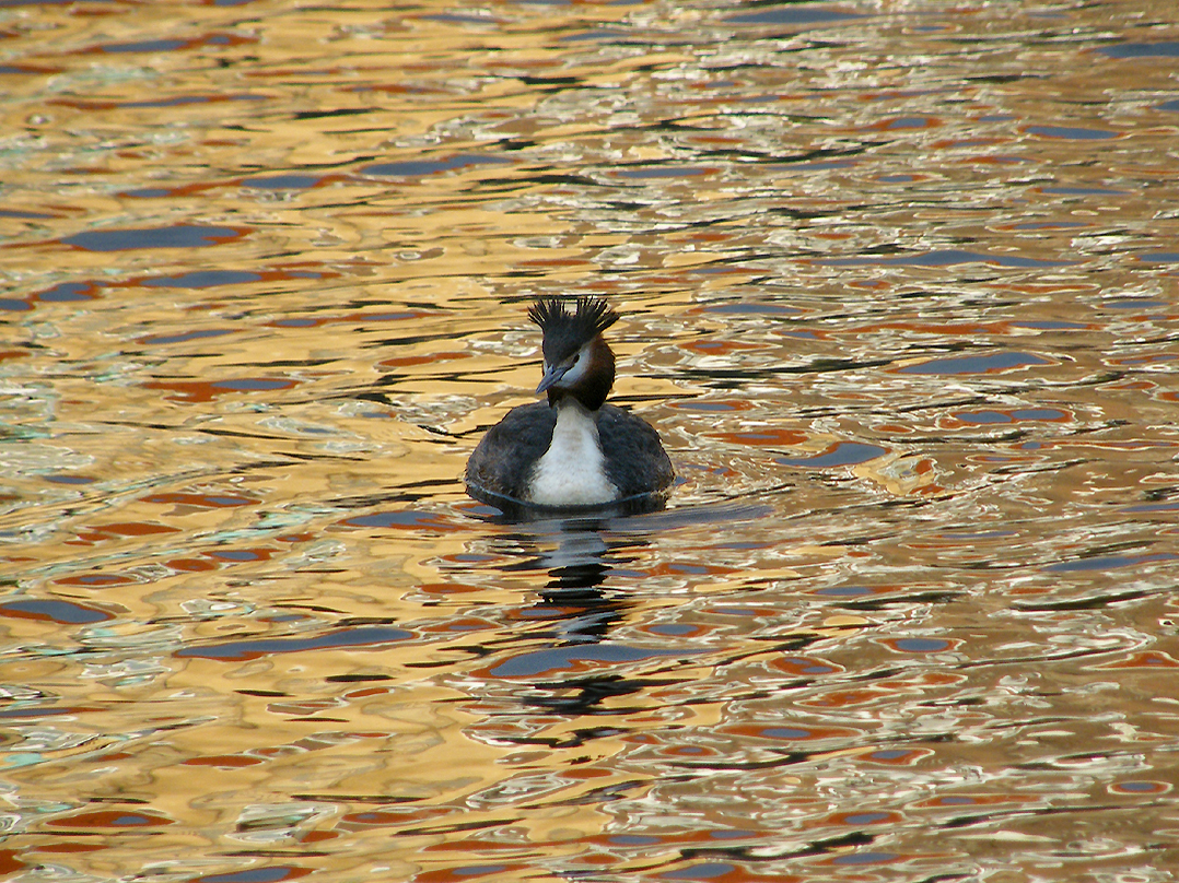 Fuut zwemmend in de binnenstad van Leiden, reflectie van de Leidse panden in de late middagzon zorgen voor een warm goudbad. De foto is twee keer in de prijzen gevallen. De foto is afgedrukt op hoogwaardig glanzend fotopapier van Fuji.