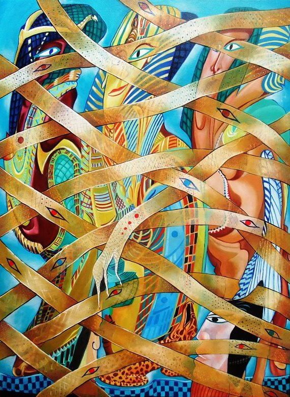 Dit schilderij is onstaan naar aanleiding van een eerder door mij gemaakt beeld dat gemaakt is van hout en daarna is gepoligrimeerd.Dit bestaande beeld heb ik zodanig bewerkt, dat alle drie de aanzichten in verwrongen toestand zijn te zien. Dit was het uitgangspunt voor het schilderij.